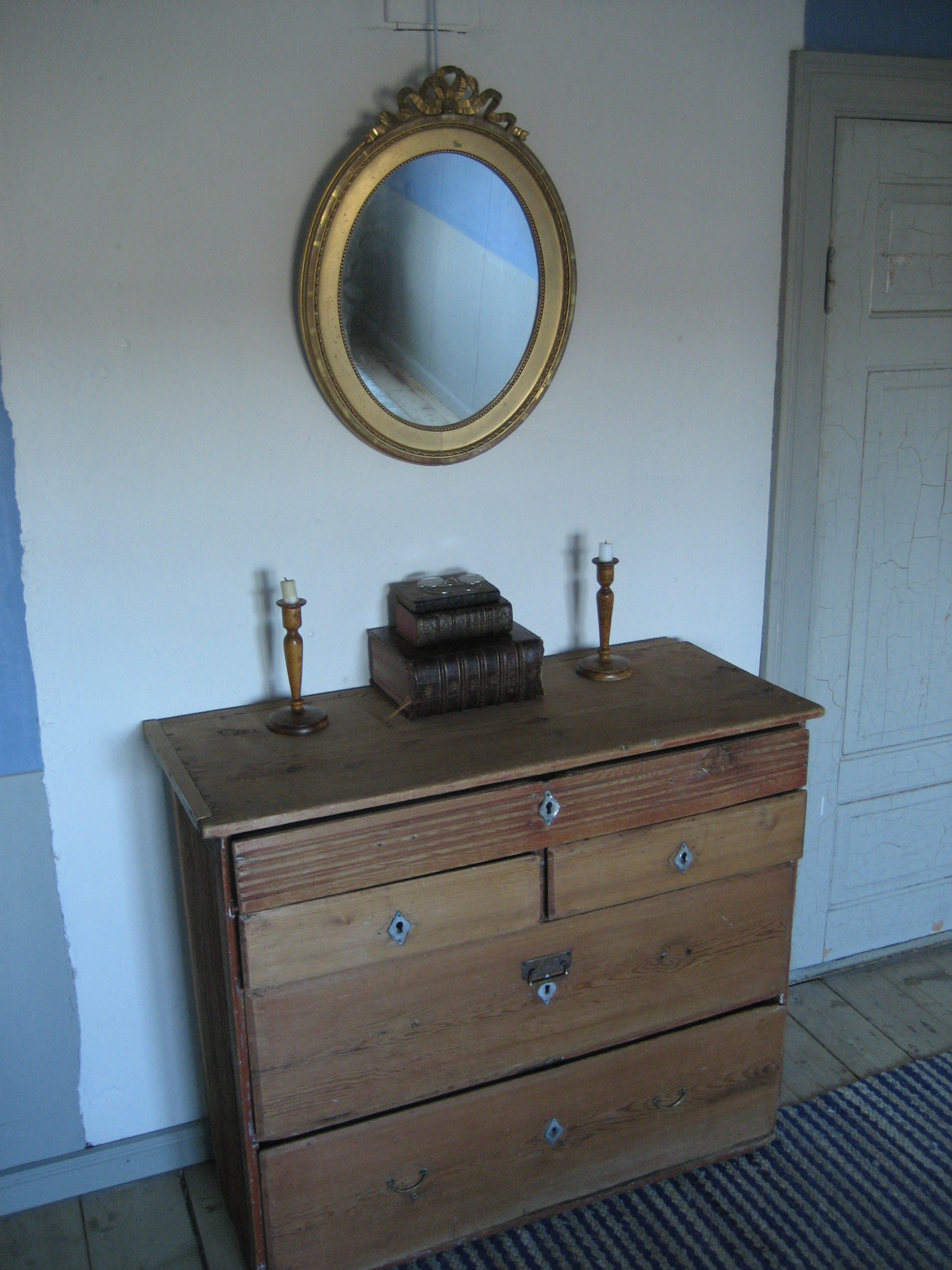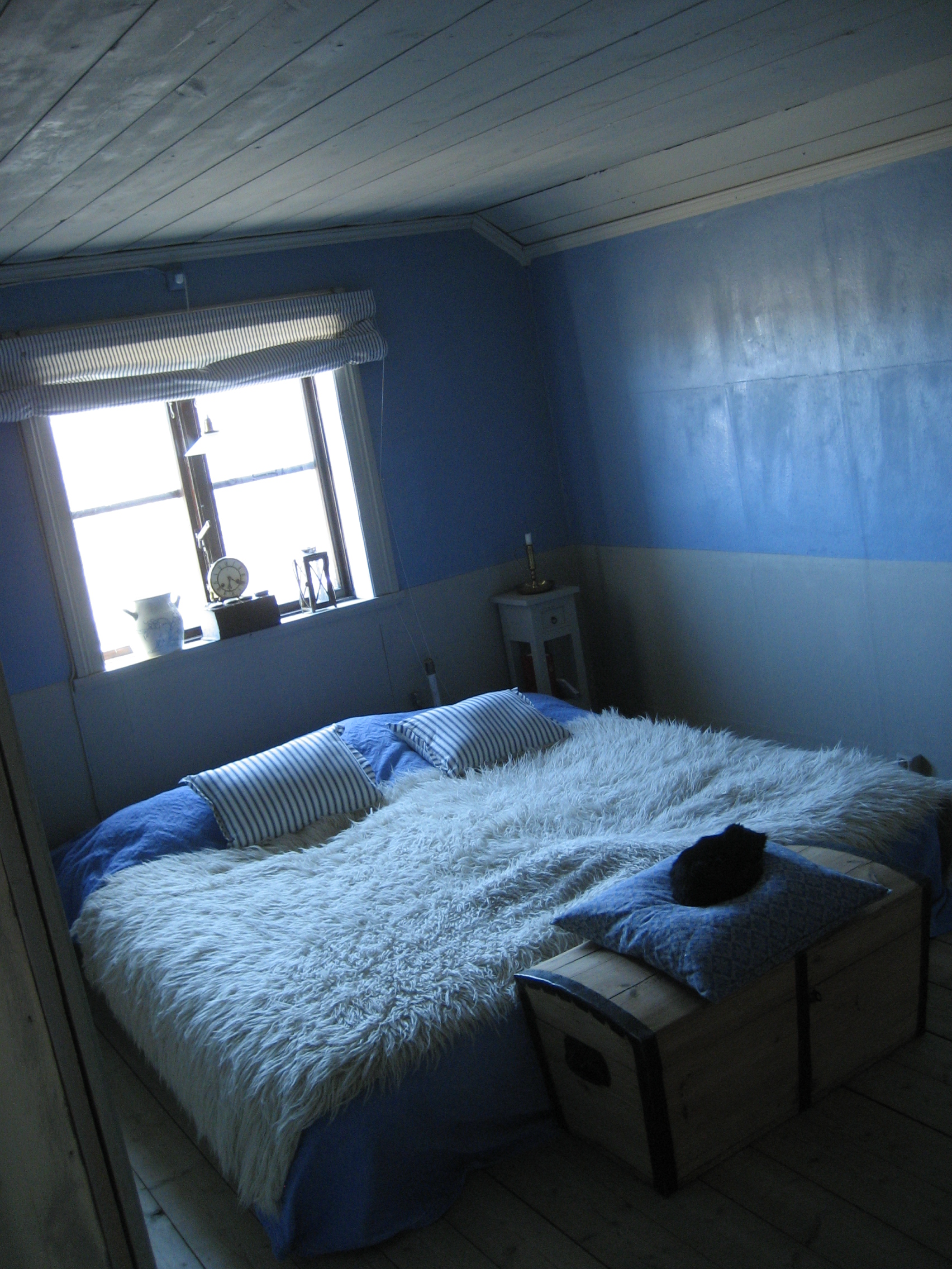 Inför bilder vill jag lägga till att det inte är helt klart, en ny lysknapp och lite foder i fönsternischen ska till och den blå färgen hoppas vi kunna sätta schabloner på när vi hittar ett trevligt mönster. Rummet gapar just nu sent 1700-tal, det ser rätt grymt ut och det känns som att vakna i en 1700-talsgård varje morgon. Trevligt men tanken är att schablonerna ska tona ner intrycket något och göra rummet lite mer 1800-tal och mer tidsenligt.
