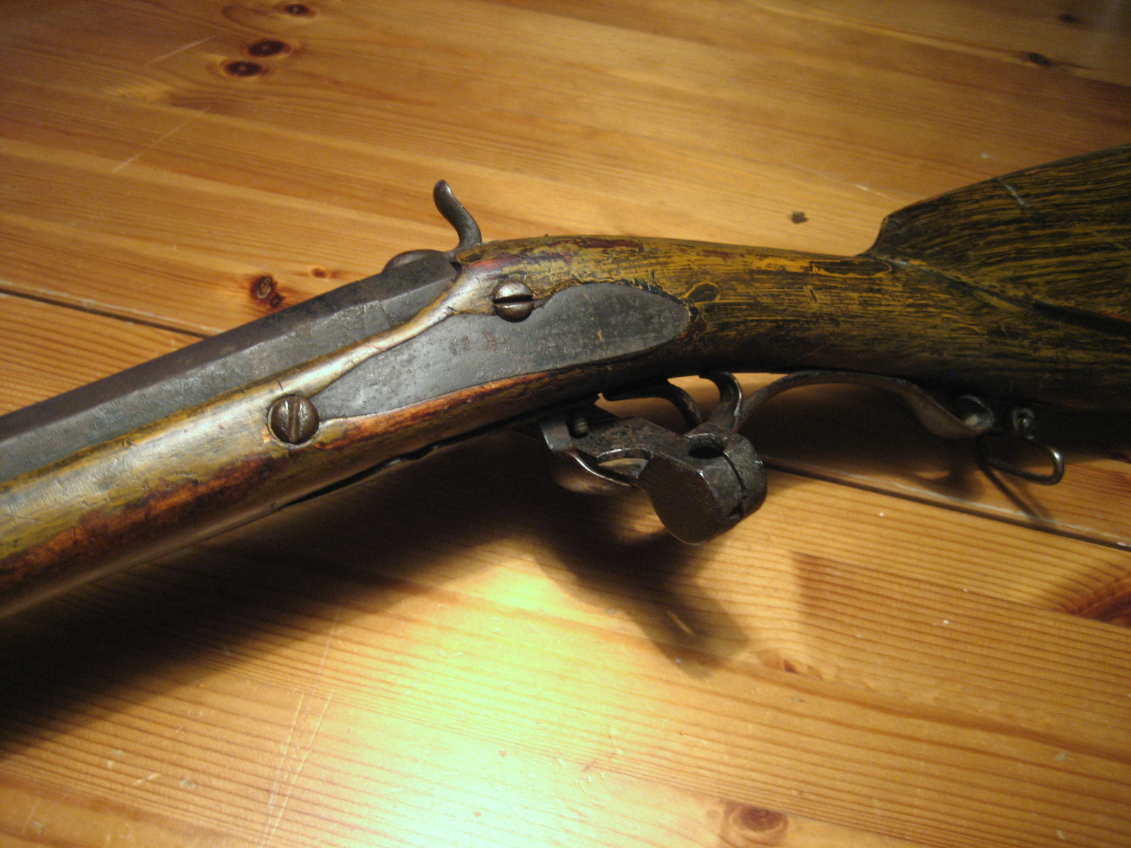 Det rör sig om en professionellt tillverkat gevär som byggts om av en vapensmed. Linjerna är eleganta och stocken är fiskstjärtsformad. Men vad är det så som är konstigt? Jo det finns några underliga detaljer. För det första har hela geväret ådringsmålats. Varför då? Slitaget på färgen tyder på att det gjordes under brukstiden och det bör vara för att det ska, liksom i den enkla möbelsnickaren värld, likna ex valnötsstock i detta fall. Kanske är stocken i björk och jag har aldrig stött på en målad stock över huvudtaget. Vanligt knep på möbler som sagt under sent 1800-tal. Det ger bössan ett egendomligt utseende och det ser rätt taffligt ut. Liksom sidobläcket:
