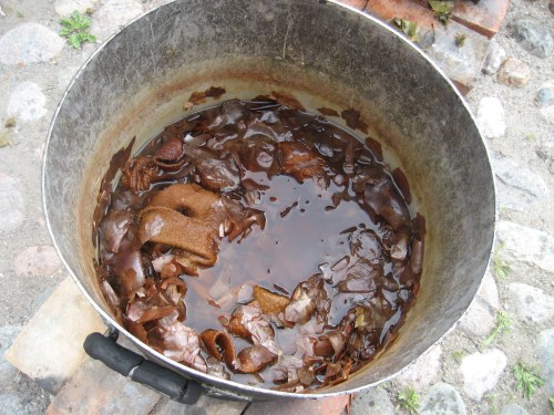 Vi tog hela kakan, ett halvt kg och rörde ner i varmt vatten som kokade upp. När cutchen blir blöt blir det en klistrig kådliknande massa. Det färgar av sig grymt och efter mycket rörning löser den upp sig totalt i vattnet.