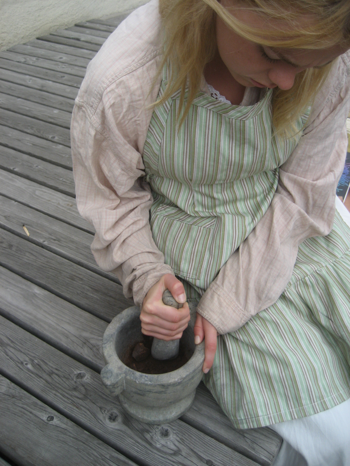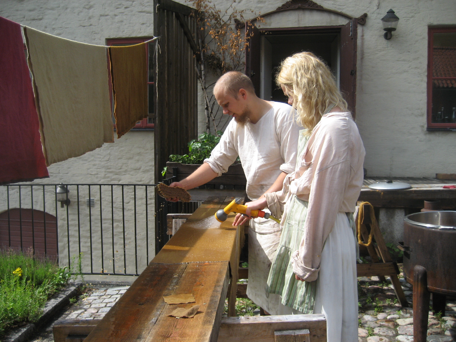 Vi använde oss av pulveriserat granatäppelskal vilket ska under medeltiden ha används som färgmedel i handskrifter. Pulvret såg mycket medioker ut i sin trista blekbeigea förpackning, våra förhoppningar var intet annat än klena. I vårt bad nedlade vi 1 m tyg, några härvor garn och en medeltida grå fruhätta som Fia från reenactmentsföreningen Bondeuppbådet tog med. Kunde detta medelmåtta pulver verkligen ge något?