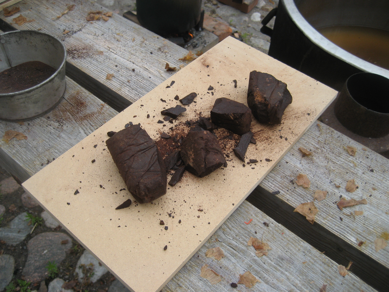 Om vi börjar med Cutch som brukats i många hundra år, åtminstone sen 1500-talet. Jag hade hört att det var ett starkt färgämne som även färgar läder. Cutchen vi hade var i form av en spännande hård kaka som i sin redlinepåse starkt påminde om en haschkaka. Denna krossade vi och mortlade till ett fint pulver.