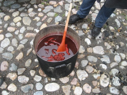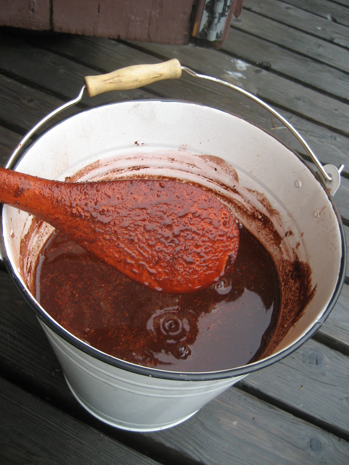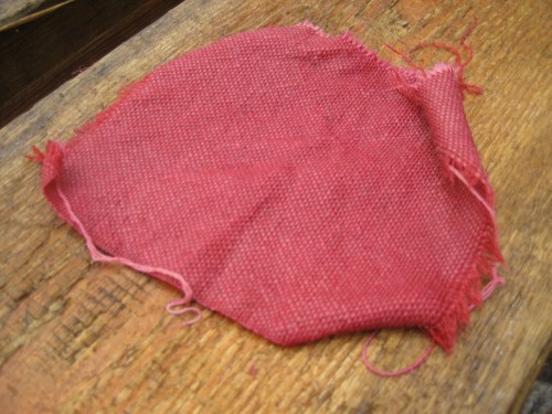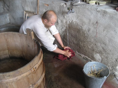 Dagen innan blötlade vi koschenillen i en liter vatten.Vi brukte ganska mycket, så pass att innehållet i hinken var likt slaktblod, mörkt. Koncentratet späddes och i färgbadet la jag i ett tyg som länge väntat på en ordentlig omfärgning. Detta ganska fina ylletyg hade missfärgats vid en tidigare färgning och såg ut so en blekröd trasa som en vätte snyts sig i åtskilliga gånger. Bakgrunden kan läsas här. Nu hoppades jag på att missfärgningarna effektivt skulle ätas upp av den kraftiga färgen. Färgen såg lovande ut och efter en intensiv sköljning var det spännande.