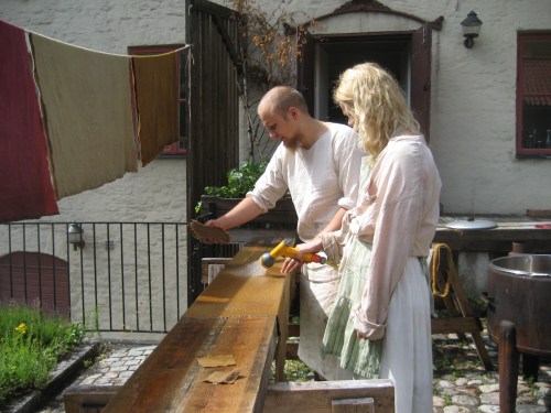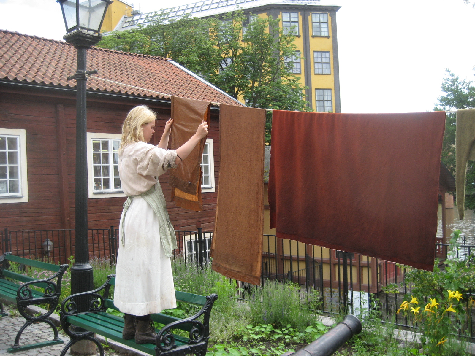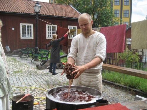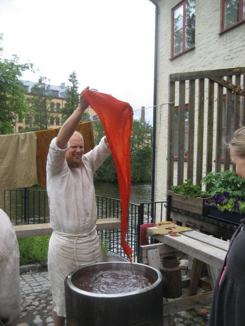 Bergling har fler taktiska tips för detta färgbad som involverar eldningstekniker och att man kan blanda i bresiljaspån för att bättra på färgen. Du kan läsa Berglings hela kapitel om linnefärgning i min nedladdningspf här. Det är intressant läsning och jag ställer mig genast frågan, hur ska vi se på reenactment och färgning? Det är givetvis optimalt med växtfärgade tyger i våra utstyrslar men hur är de färgade? Vi har en förmåga att rationalisera färgningsprocessen men den gamla färgarlitteraturen bjuder på hundraåriga erfarenheter som inte kan mätas med den litteratur som idag brukas alltjämt bland oss amatörer. De ursprungliga recepten är avancerade i flera steg och som kan bjuda på helt nya historiska utmaningar i vår återskapning. Låt oss inte underskatta färgarskrånas kollektiva kunskap som ofta kan te sig komisk idag med sina obskyra ingredienser.