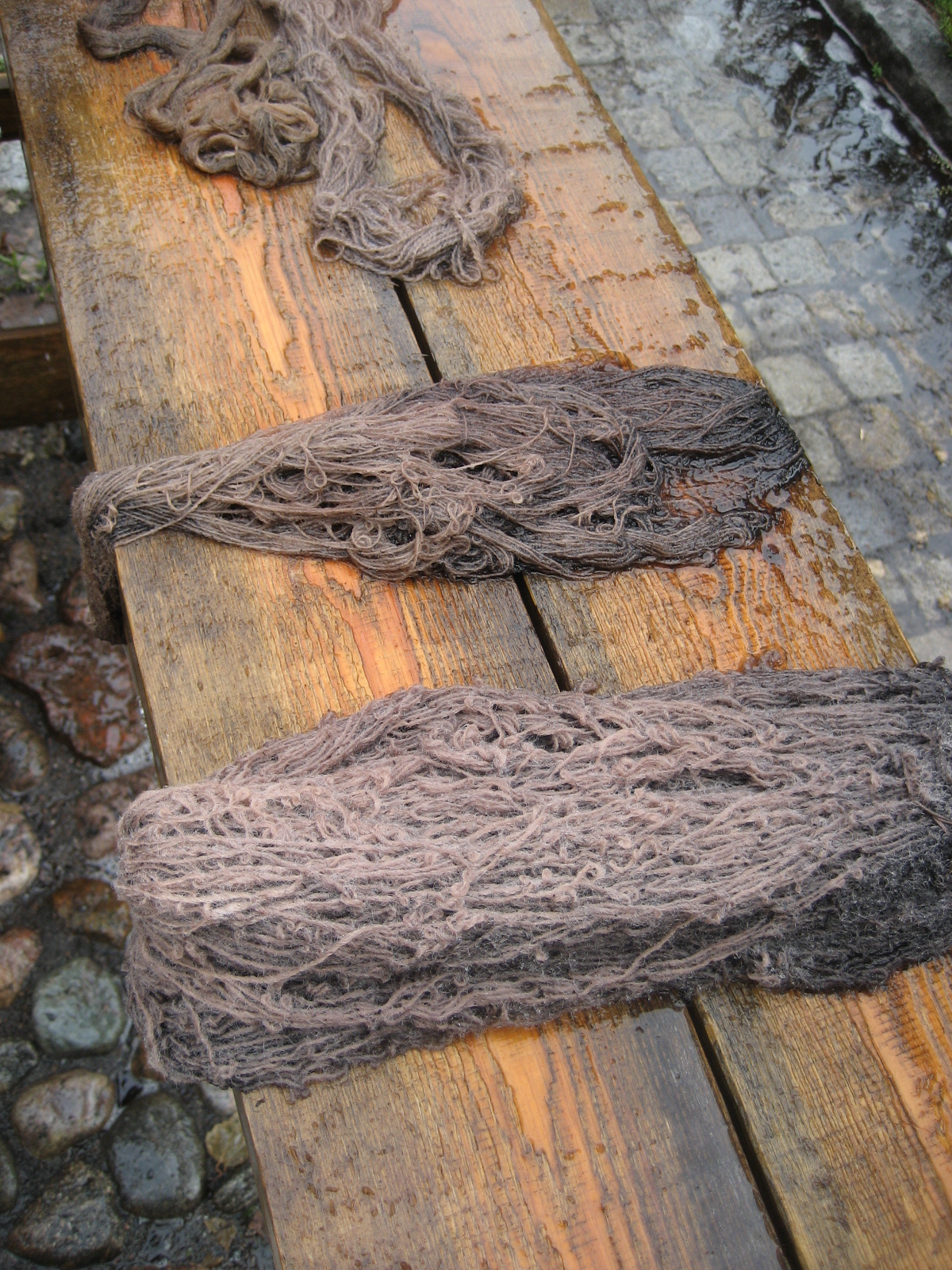Vi nedlade lite garn, ylle och några linnedukar för att se om färgen tog i linnet. Det fick ligga i en dryg timme och det visade en del intressanta resultat. Efter noggrann sköljning så visade sig att linnet tog bäst och sämre på ylle och linne. Yllet och garnet blev ganska ljusbrunt och linnet något brunare.