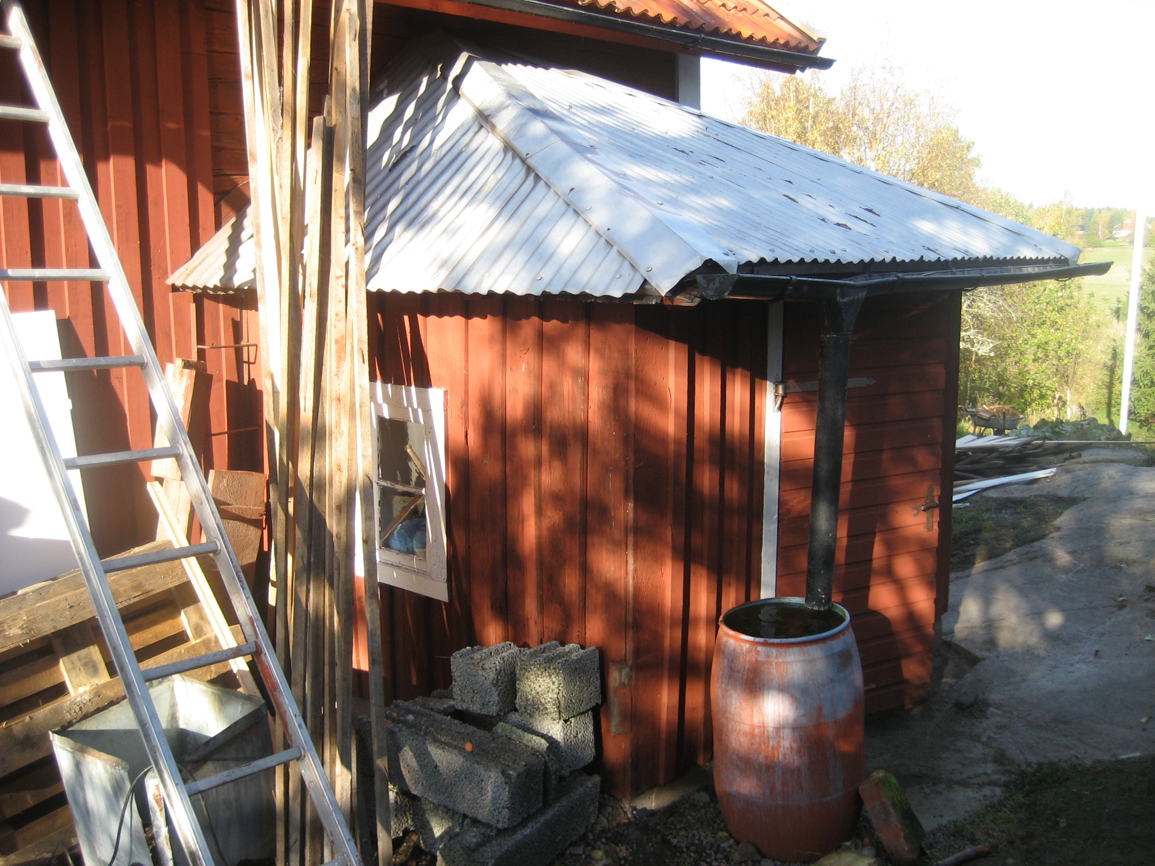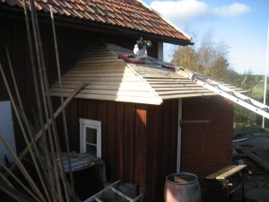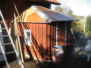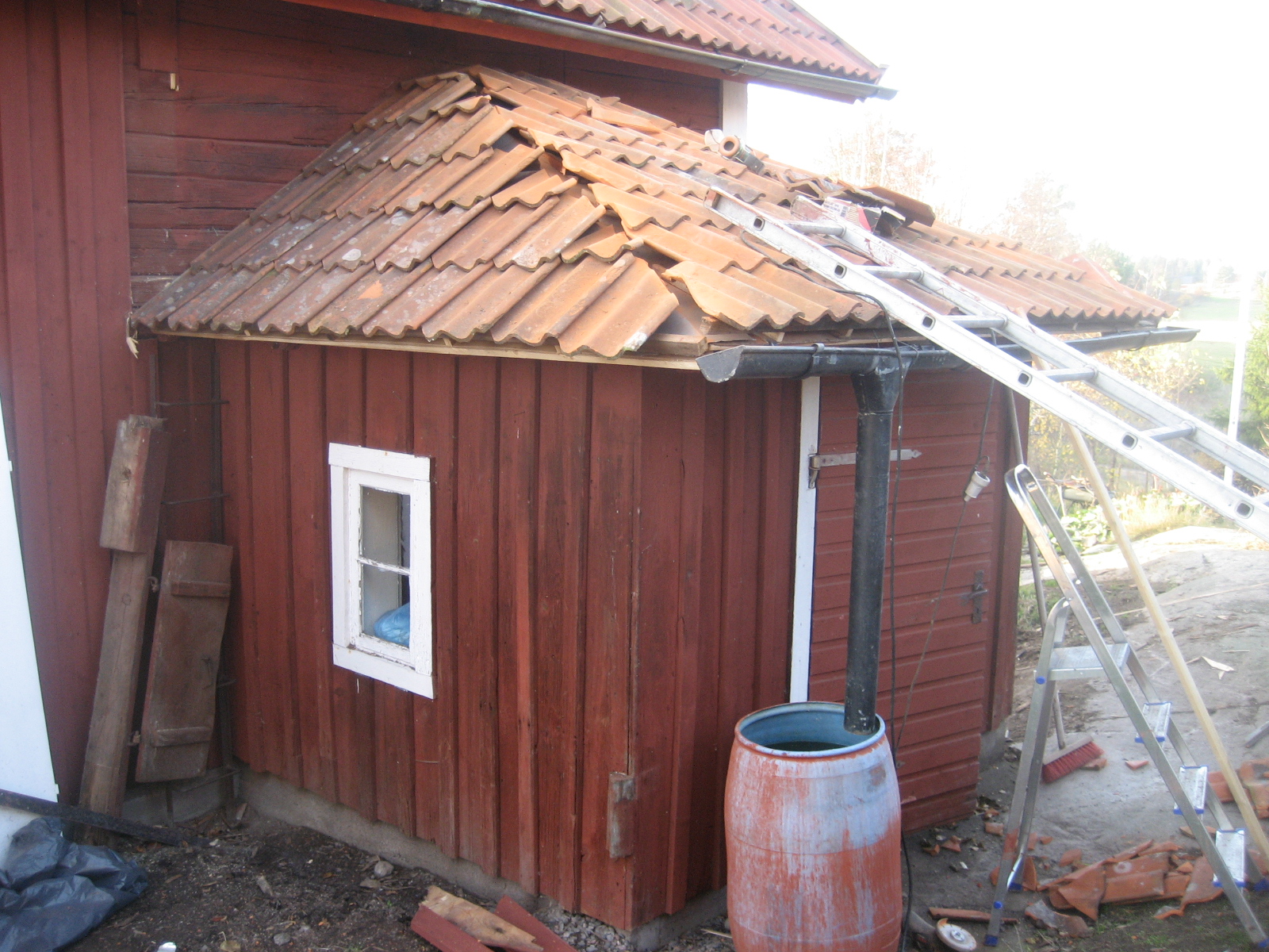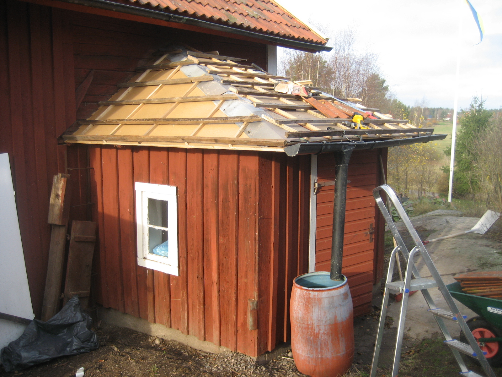 Nu har jag lagt om taket på hallen på ladan. Ett läckande problemtak som nu åtgärdats med i princip det jag hade hemma. Oanvänd fjällpanel från förra ägarna, skräpvirke, gammal begagnad läkt och taktegel ifrån en släkting. För 200 kr kan man komma så här långt: