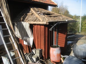 3. Spånen täcker nu marken omkring och de nakna takstolarna berättar om takkonstruktion och så länge som huset haft denna utbyggnad har huset varit målat rött. Utbyggnaden är ganska gammal, åtminstone sent 1800-tal.