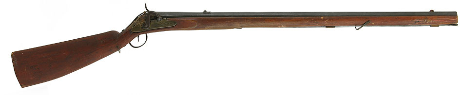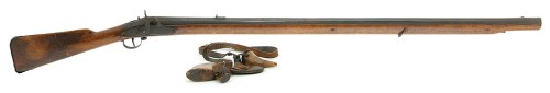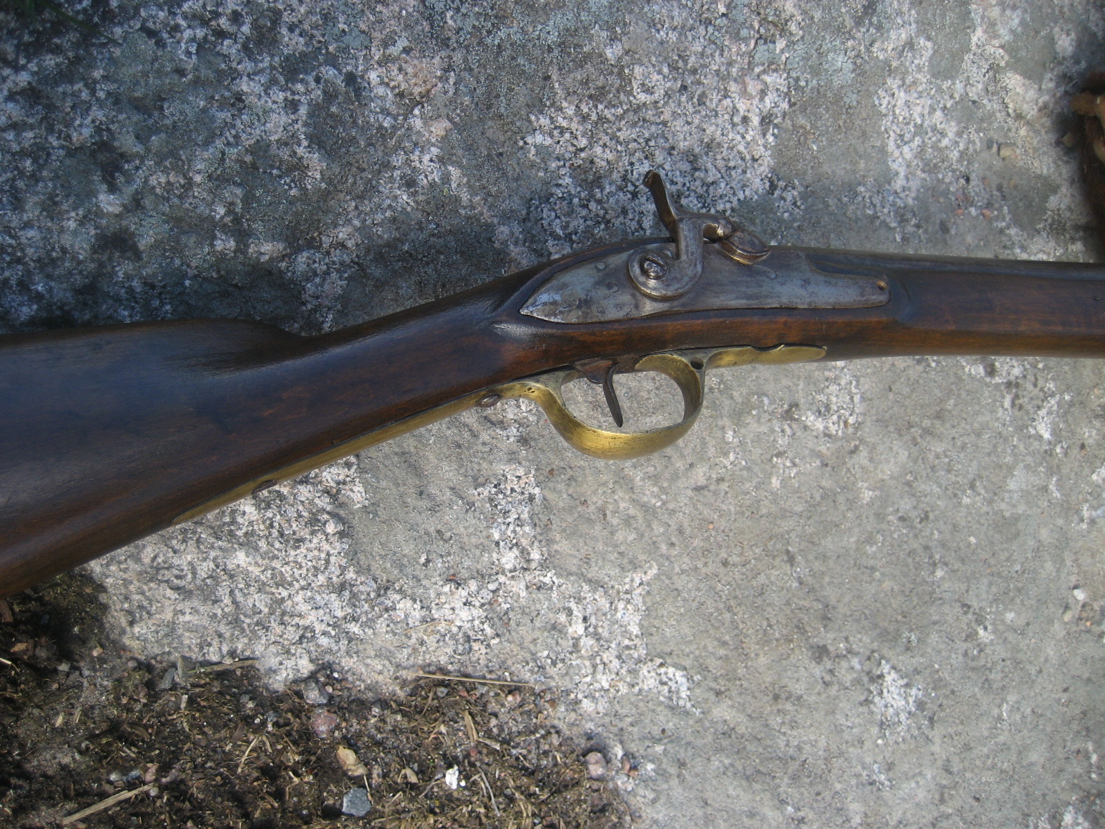 Vad är nu detta? Ingen aning om jag ska vara ärlig. Total avsaknad av stämplar, okänt träslag och blandning av mässing och järn. Till estetiken påminner det lite om en Brown Bess som skalats ner till en dambössa. Pipan har haft ett litet sikte på pipan har märkningar framtill efter modifieringar. Pipan har försetts med ett järnband längst fram likt en trumf. Det har jag sällan skådat förut. Jag misstänker att stocken är i björk då den är fjäderlätt och att den betsats valnötsbrun. Underbeslaget är av militär typ och låset är ett konverterat flintlås, troligen svenskt armélås som haft varhake. Återkommer med exakt modell. Jag tror det rör sig om ett halvfolkligt bygge av diverse olika delar från sent 1800-tal.