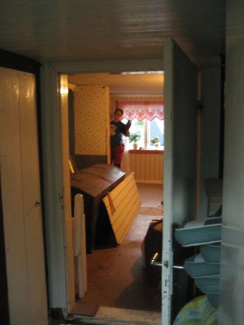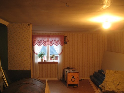 Välkommen! Detta är en liten hall in till stora rummet. De som följt denna blogg vet att det numera är tegeltak på taken.