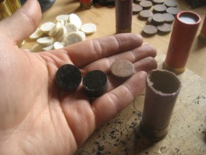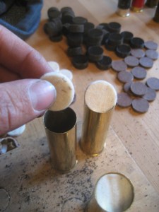 Steg 4. Förladdningar. Istället för plastkopp används köpta förladdningar. Det går också att begagna sig av hemmagjorda om man har ett håljärn och lämpligt material som filt, kork och papp. Dessa förladdningar är väldigt billiga så det är värt att köpa. I det här fallet börjar jag med en skiva av hård papp som ska sitta tätt över krutet och sen två förladdningar av filtat hästhår (yeeehaaa!). Pressa ner förladdningarna så hårt du kan med en rundstav eller liknande.