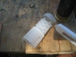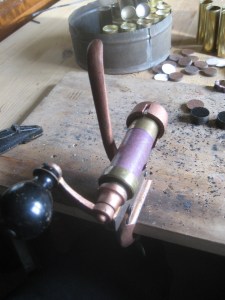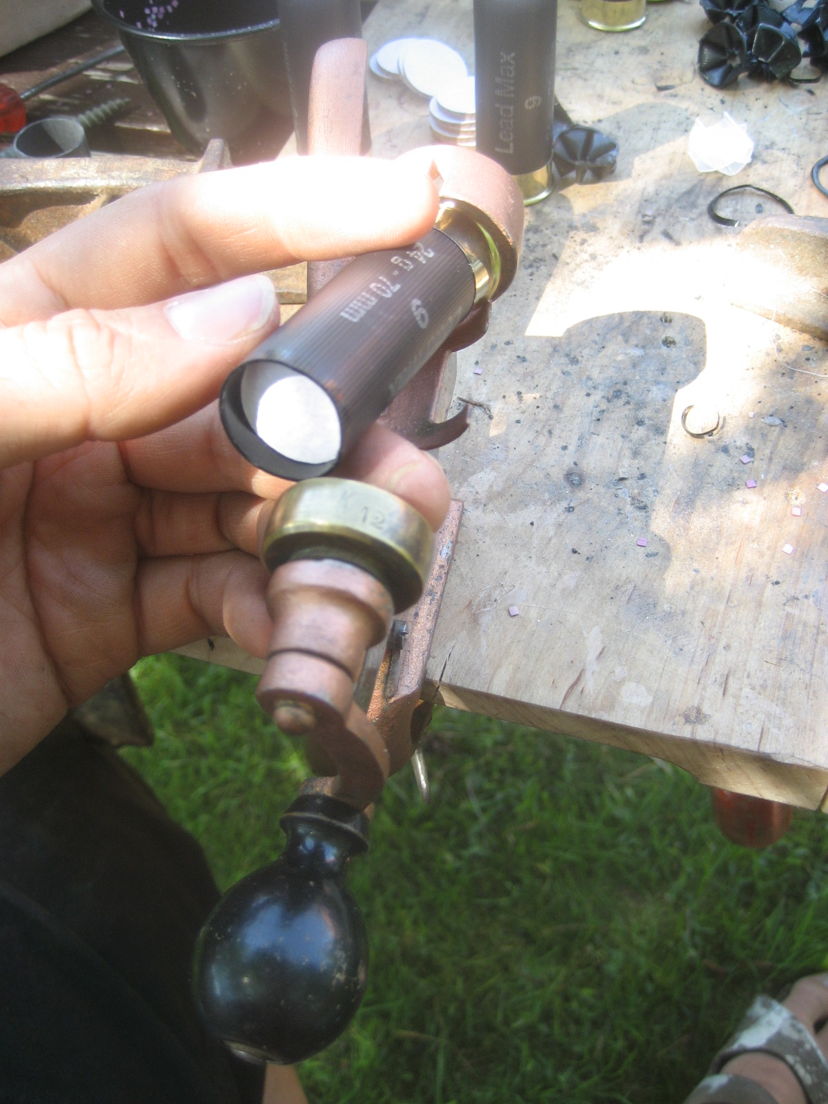 Steg 6. Förseglingen kan göras på olika sätt. Jag använder en antik rullstukare, dessa grunkor återfinns på auktioner, vapenforum, militariamässor och liknande. Har du ingen får du försegla patronen med ett lager trälim utspätt med vatten. Det är nyttigt om det finns ett visst motstånd för krutladdningen annars blir farten dålig. Jag rekommenderar en rullstukare, det blir mycket bättre och snyggare.