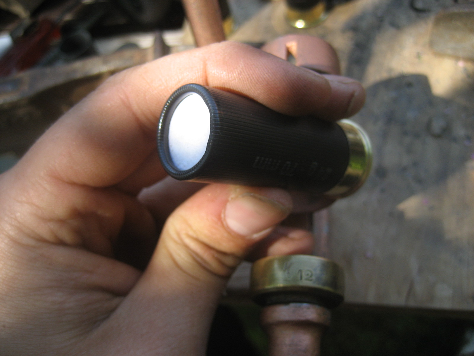 Steg 3. När det kommer till förladdningar finns det ett litet krux. Mässingshylsor är tunnare än plast och papper vilket gör att vanliga kaliber 12 förladdningar är något för små. Bäst lämpade är kaliber 11 som går att beställa. Jag har bara apdyra filtförladdningar från skytteservice som är kaliber 11. Det finns mycket billigare att beställa från det stora landet i väst.  Jag löser detta genom att använda en filtförladdning i kaliber 11, sen samma som i omladdade pappatronerna. För att täta till det i hylsan tejpar jag de tjocka förladdningarna med maskeringstejp. Jag kommer beställa rätt storlek så småningom, men vi är alla barn i början. Men huvudsaken är att det blir tätt för krutgaserna.