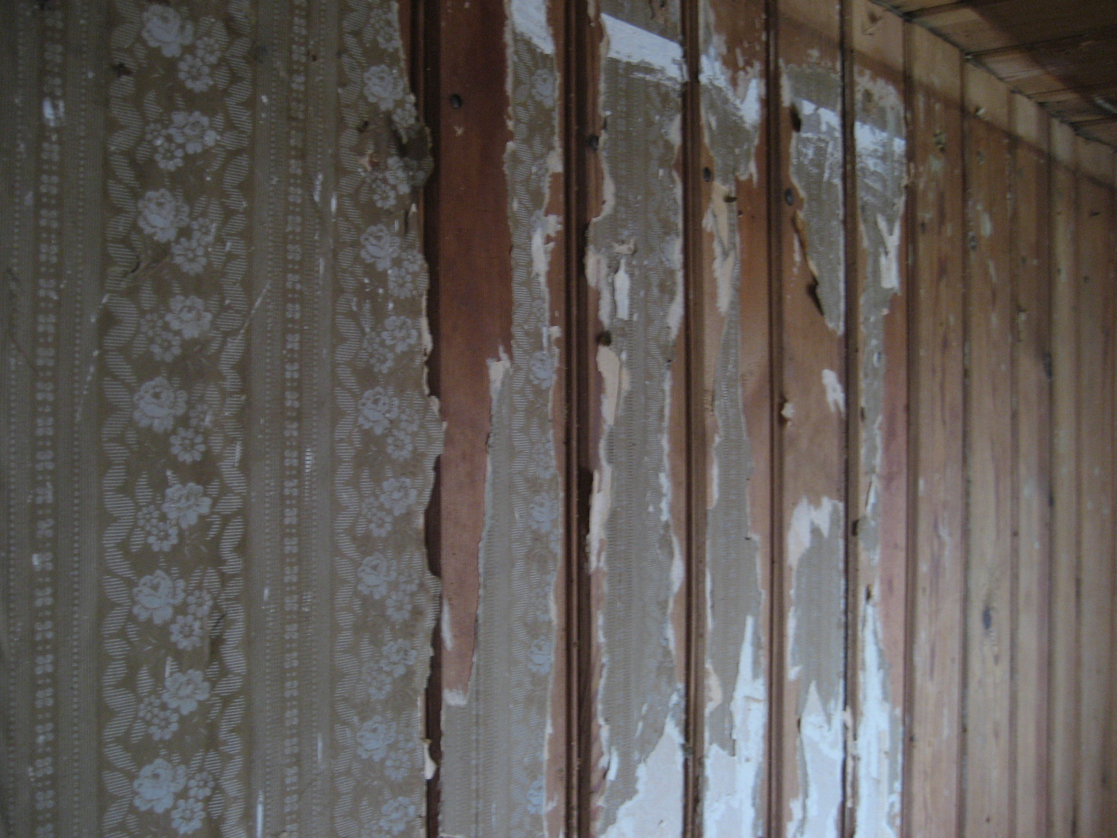 Dessa två tapet tycks vara de äldsta och vad som är märkligt är att det varvas vilken som är underst. Det kan tyda på att detta är gamla tapeter som används som utslätning på underlaget som precis som i taket är pärlspont. Pärlsponten har inte varit målad vare sig i taket eller på väggen vilket tyder på att utrymmet varit mycket enkelt, alternativ att pärlsponten tapetserades över redan från början. Det sistnämnda grumlas något av att panelen färgats av sol och smuts som tydligt ses där taklisten suttit. Taket har sotats av eldstaden så nog dröjde det något innan tapeterna och spännpappen kom upp. Det hela är något kryptiskt och fördunklar rummets ursprungliga karaktär och funktion. I vilket fall blir det krog nu.
