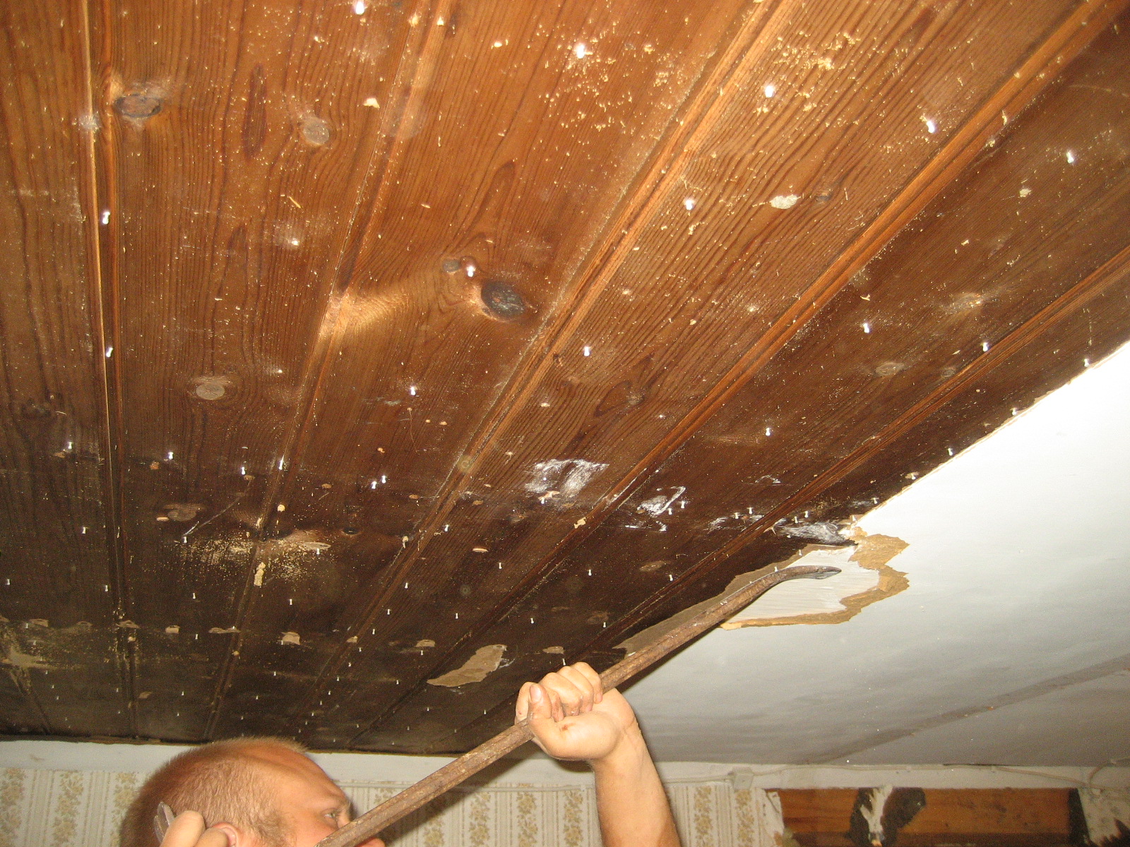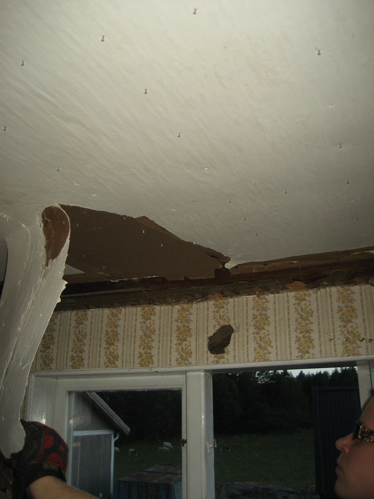 Vi började med taket som var täckt med masonit och spännpapp i två lager, 300 miljarder småspik i snöräta rader. Det spikarna satt i förvånade oss, det var pärlspont, den bredaste man kan tänka sig spikad synligt med smidd spik. Det visade sig även att den var delvis handhyvlad vilket också pekar på en hög ålder för att vara pärlspont.