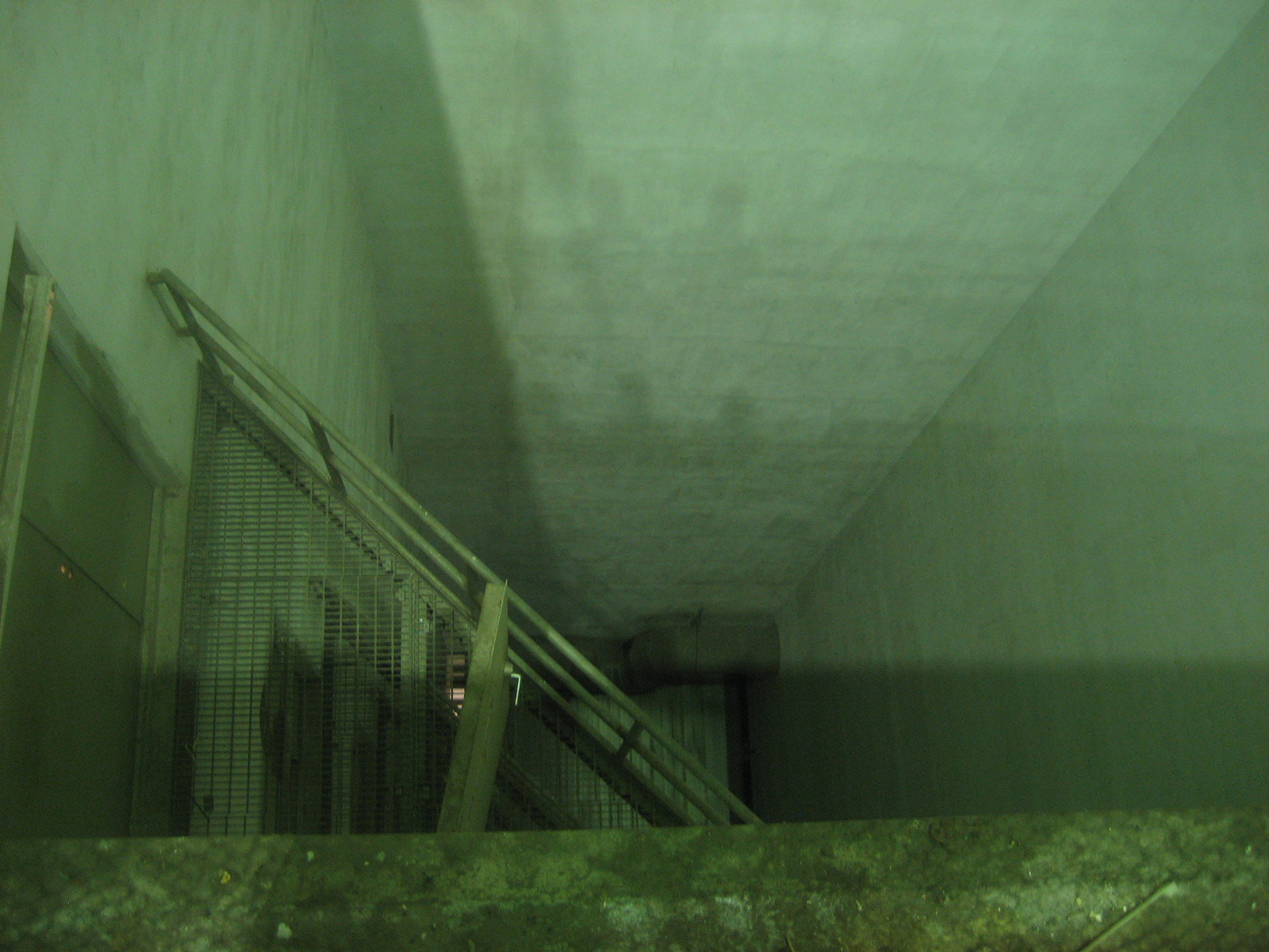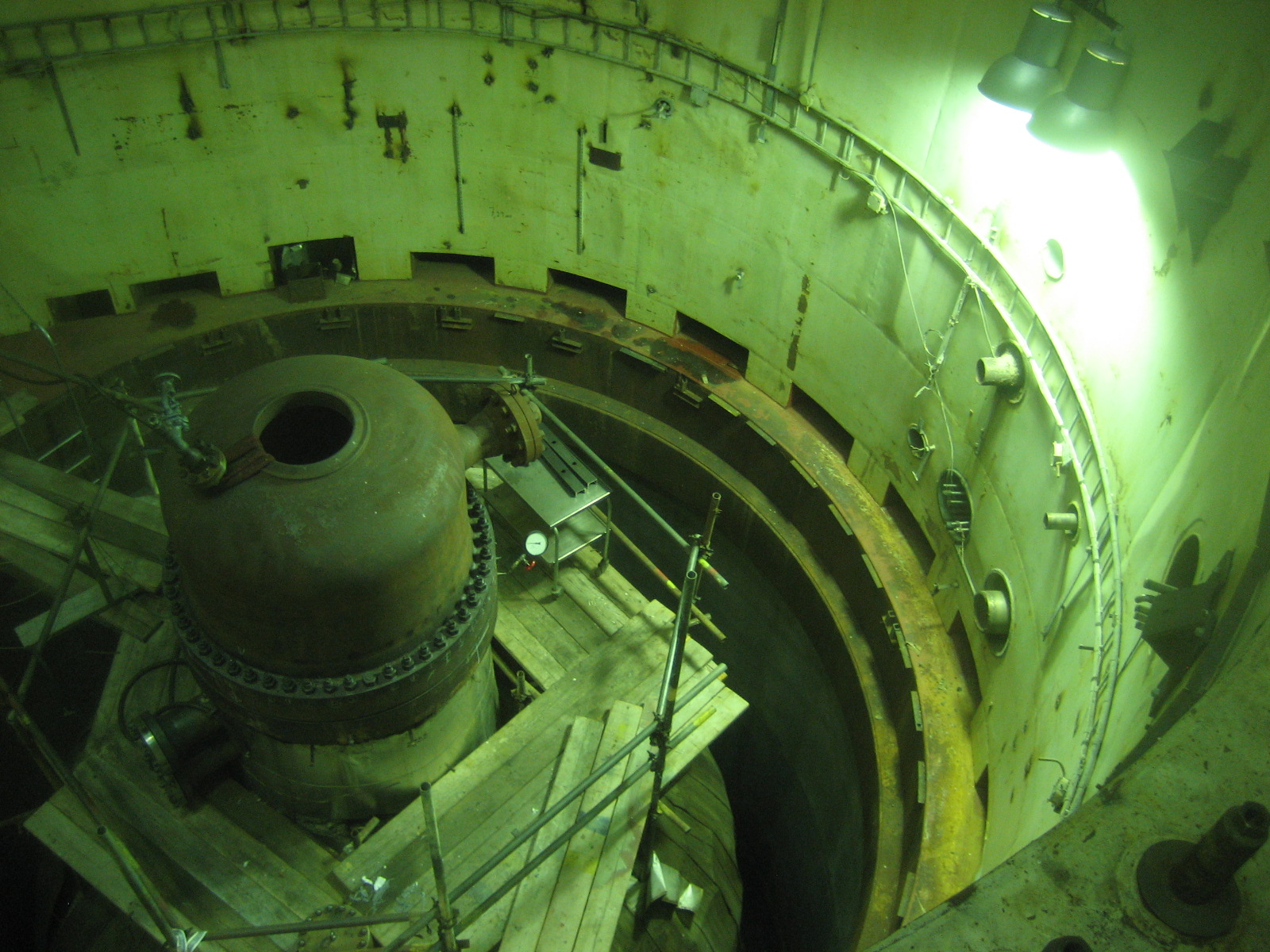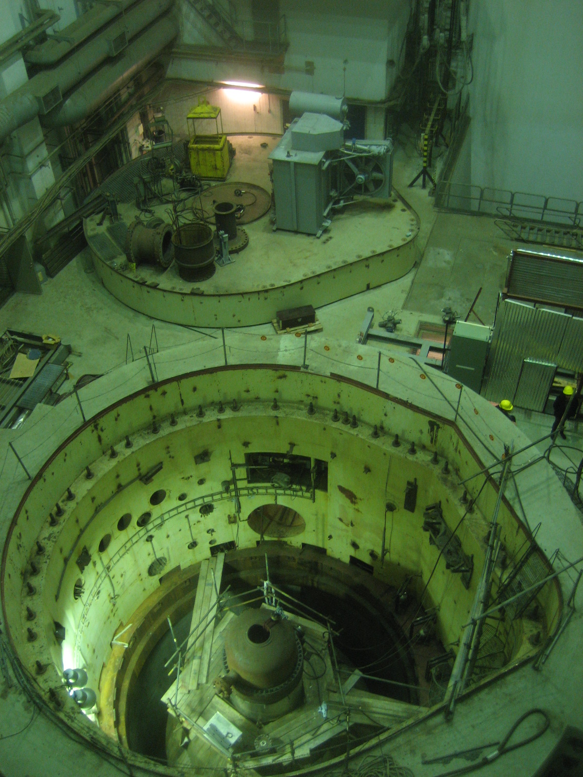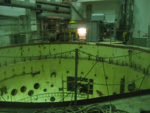 Precis bredvid reaktorn finns en brådstörtande schakt där bränslet skulle hissas upp när reaktorn skulle laddas. Jag grips lätt av den känslan man kan få av stora rymdskepp på film, fast här i en sliten och dämpad travesti.