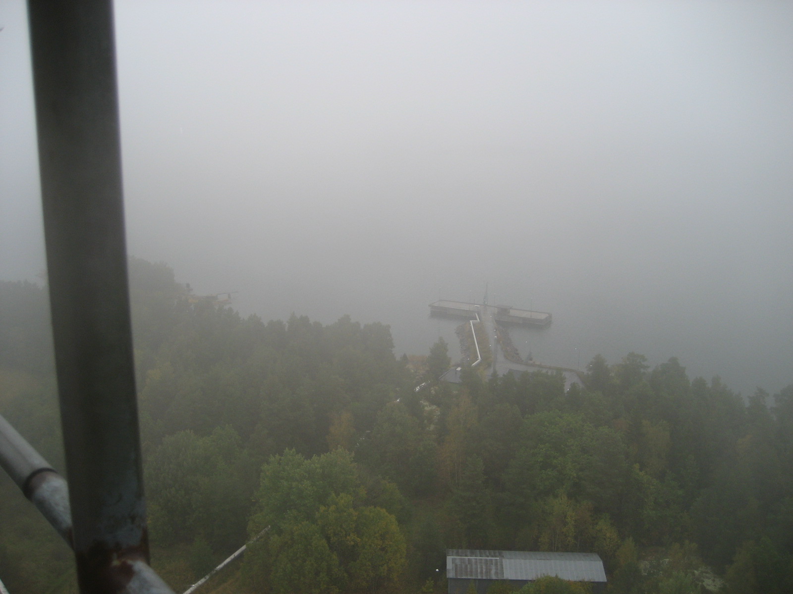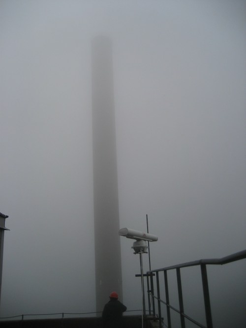Vi gick ut på taket på reaktorbyggnaden. Dessvärre satte sig dimman i vägen för utsikten, platsen är populär bland fågelskådare. Skorstenen som skymtar i dimman tillhör oljekraftverket bredvid, den är drygt 140 meter hög.