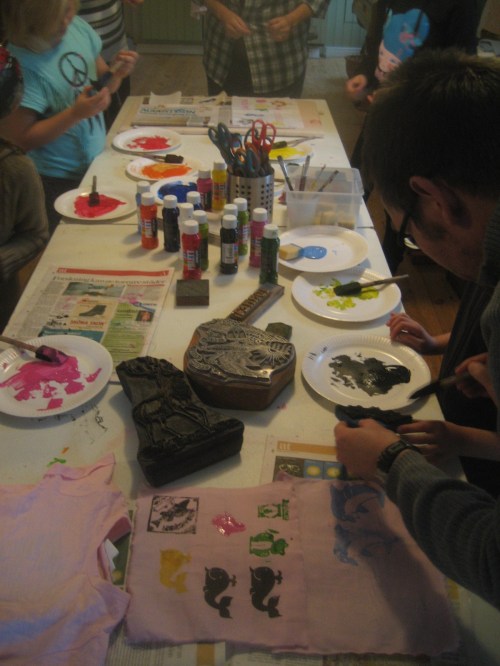 En veckas höstlovsaktivitet är till ända på Norrköpings stadsmuseum. Det har lockat många barn och ungdom att pröva på att trycka på tyg som varit veckans tema. Vi inhandlade textilfärg, svampar, bomullstyg, potatis och så lyckades vi skaka fram ett antal gamla tryckstockar ifrån museets samlingar. Besökarna fick också göra egna tryckstockar i potatis och trycka med färdiga skumgummiformar, men vad som kanske är mest relevant för denna blogg är de tryck som gjordes med originaltryckstockar.