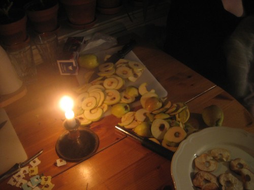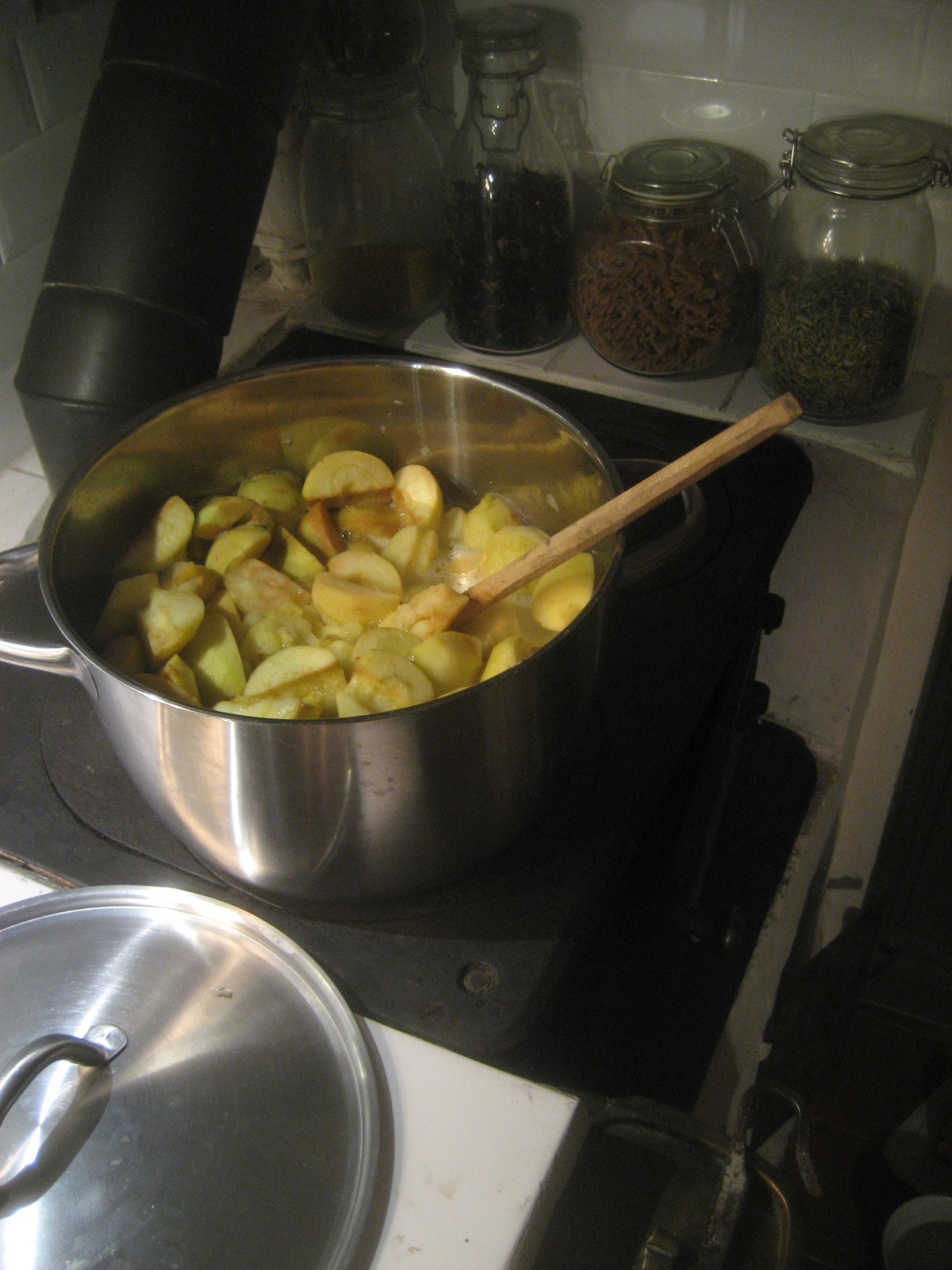 Sen har vi kokat äppelmos och frugan har gjort äppelchips och torkat dem på en spolhållare. Sen har vi fryst in saft, vinbär och torkat svamp.