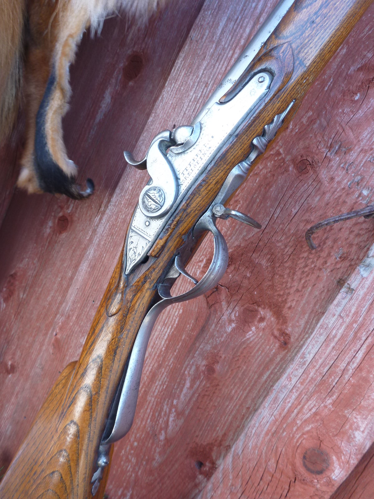 5 minuter in i mässan slog jag till på en folklig, ovanligt lång allmogebössa. Det främst stockningen och priset som jag föll för. Stockens eftersläpande stilelement är intressanta, särskilt formkänslan och dekorationerna med små skurna kryss. Komplett med laddstake och kolvlåda. Jag köper vanligen inte vapen byggd på militära delar men detta blev ett undantag. Vi klurade en del i bilen på väg hem och kan det vara så att det är en svensk 1805 års reparationsmodell som slaktats på 1800-talet för att bygga en jaktbössa? 1805:an byggdes bland annat på delar från m/1747 flintlåsmusköt och det är troligen så att såväl rörkor som lås kommer ifrån en 1747 och sidobeslaget från en m/1762:a. Pipan och underbeslaget är däremot är civila. Låset är märkt med Söderhamns faktoristämpel.