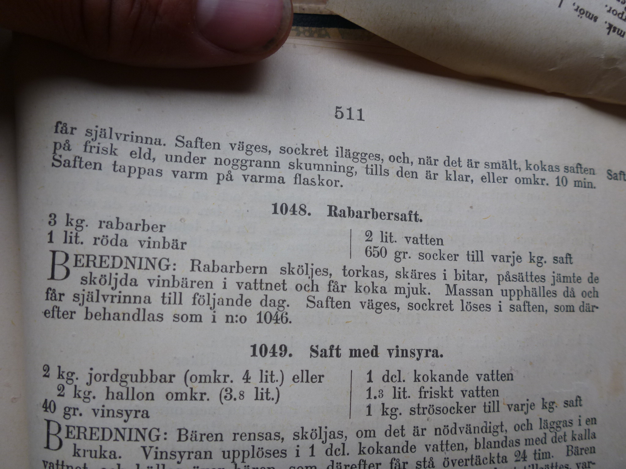 Årets första skörd blev rabarber och rabarber är som många vet en ganska knepig växt som jag föredrar att inmundiga i lagom mängder. Saft och sylt fick det bli denna gång och jag tog hjälp av Iduns kokbok från 1918. Jag passade också på att göra mig av med en annan knepig avkomma, röda vinbär. Problemet med rabarber är att de endast är ätbara i kombination med hejdlöst mycket socker, därefter kommer ett gäng bär som är ätbara en stund utan socker såsom vinbär, krusbär, lingon och liknande. I höst ska jag även se över slånbär och andra fattiga bärsorter och undersöka dess egenskaper. Det är väl i princip bara smultron, jordgubbar och hallon som utan problem kan ätas naturligt. Förr så åt man inte saker naturligt, det skulle tvunget processas på något vis, även sådan som vi finner normalt att äta rått som äpplen och päron. Folk var i gemen mycket skeptiska mot saker som den mänskliga handen inte rört vid med järngrytor och eld. I rabarberns fall finns det ju i alla fall fog för att vara skeptiskt.