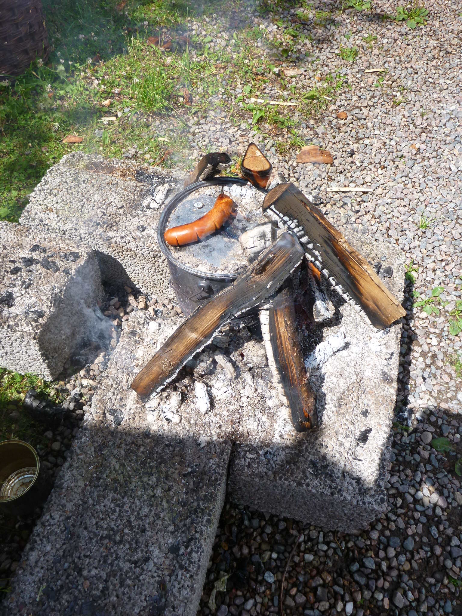 Fördelen med den här enkla metoden är att du kan steka korv på näverkärlet.