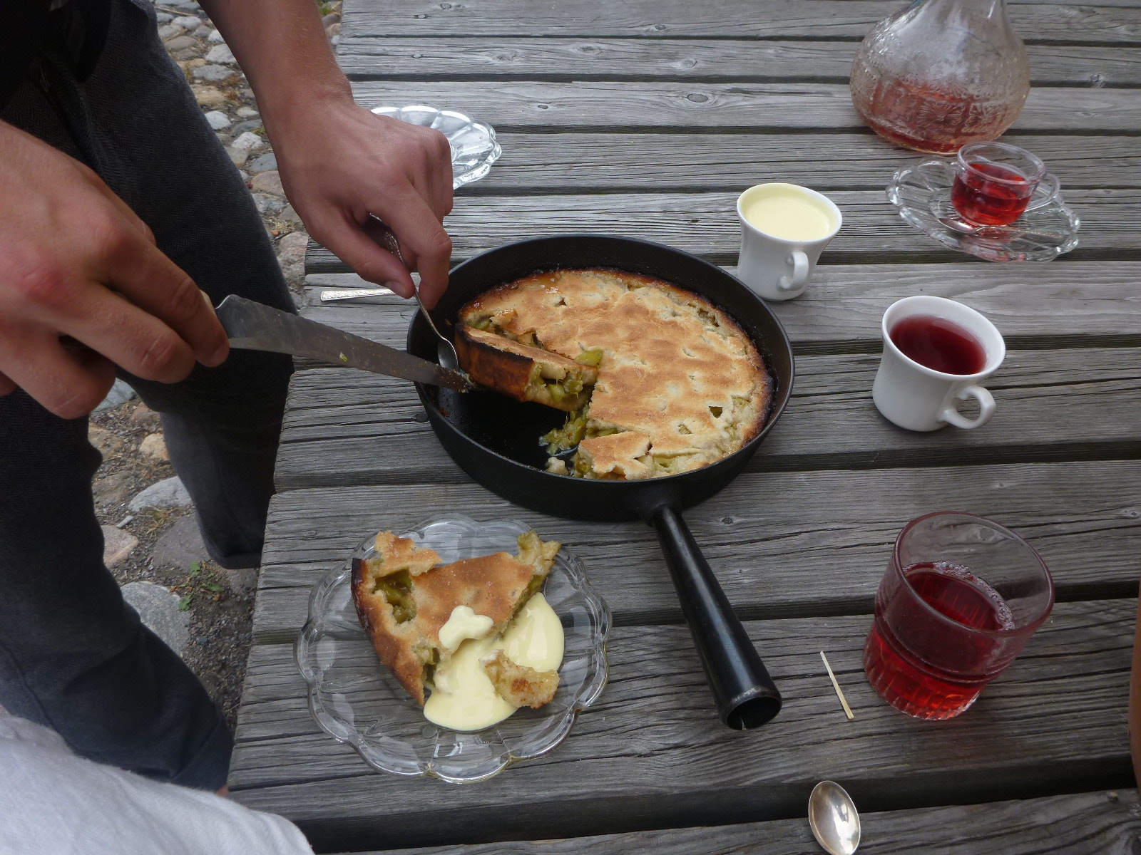 Efter endast 10 minuter såg kakan strålande ut, men vi efterbakade den med öppen lucka i ytterligare tio minuter. För ovanlighetens skull var också kakan jämt gräddad vilket sällan låter sig göras i denna spis. Jag tror att stekpannan hjälper till för en jämnare temperatur samt att vi eldat den hyfsat jämnvarm. Vi satte oss utanför och åt den tillsammans med vaniljsås i den ombytliga svenska väderleken.