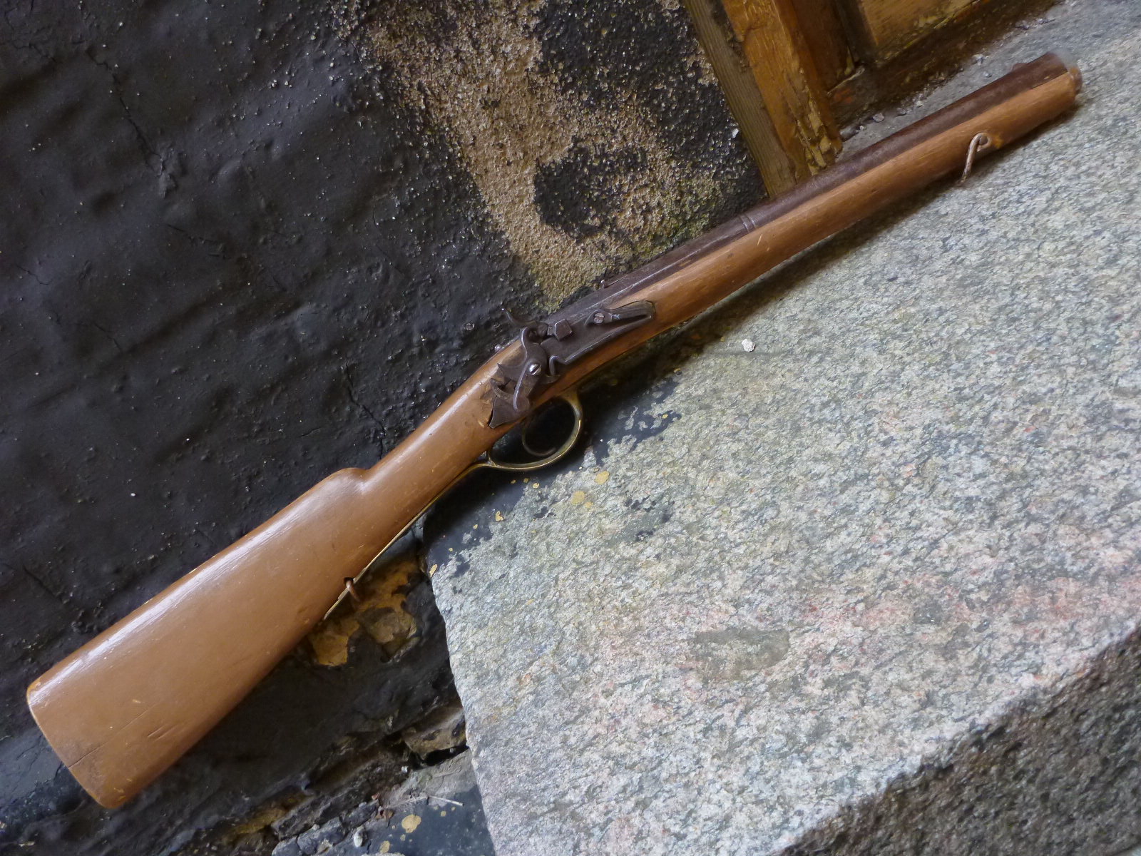 Strax efter jag köpt denna lilla bössa så kom jag över en liten lodbössa med traditionellt tåspännarlås. Också den väldigt kort men med fullång stock. Bössan är tyvärr doppad i någon slags cremebeige färg men har ett intressant utseende. Den är lika lång som den andra bössan men är den en slädbössa eller bara en ohemult kort lodbössa? Vem vet? Ibland kallar man dessa för tjuvjaktsbössor då de är lätta att gömma. Hur mycket sanning det finns i den benämningen låter jag dock vara osagt eftersom den följer ett liknande slasktrattmönster som slädebössebenämningen. Generellt sätt så är lodbössorna strikt försedda med ganska långa pipor då man trodde starkt att längden var kopplad till precisionen. Vad denna användes till lär vi aldrig veta.