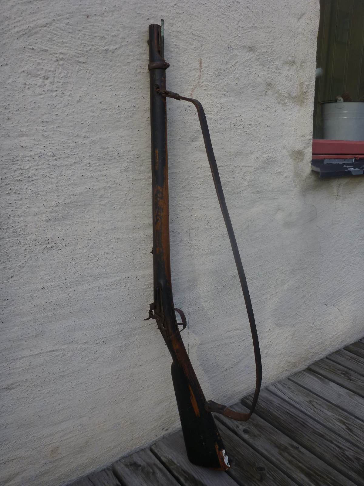 Nu hände det sig att jag köpte ytterligare en liknande bössa som måhända är tillverkad av samma bössmed. Skicket är inte lika bra men är istället rik på avtryck efter många skogsfärder. Stocken är svärtad in till den milda grad att infärgningen krakelerat i lagren längs med kolven men har även inslitningarna kring kolvhals och framstock. Näsbandet kommer ifrån ett Wredesgevär tycks det som och remmen kan vara original. Även denna bössa troligen orörd sen den fick följa med på sista turen i skogen för att skjuta på sittande järpar eller harar.