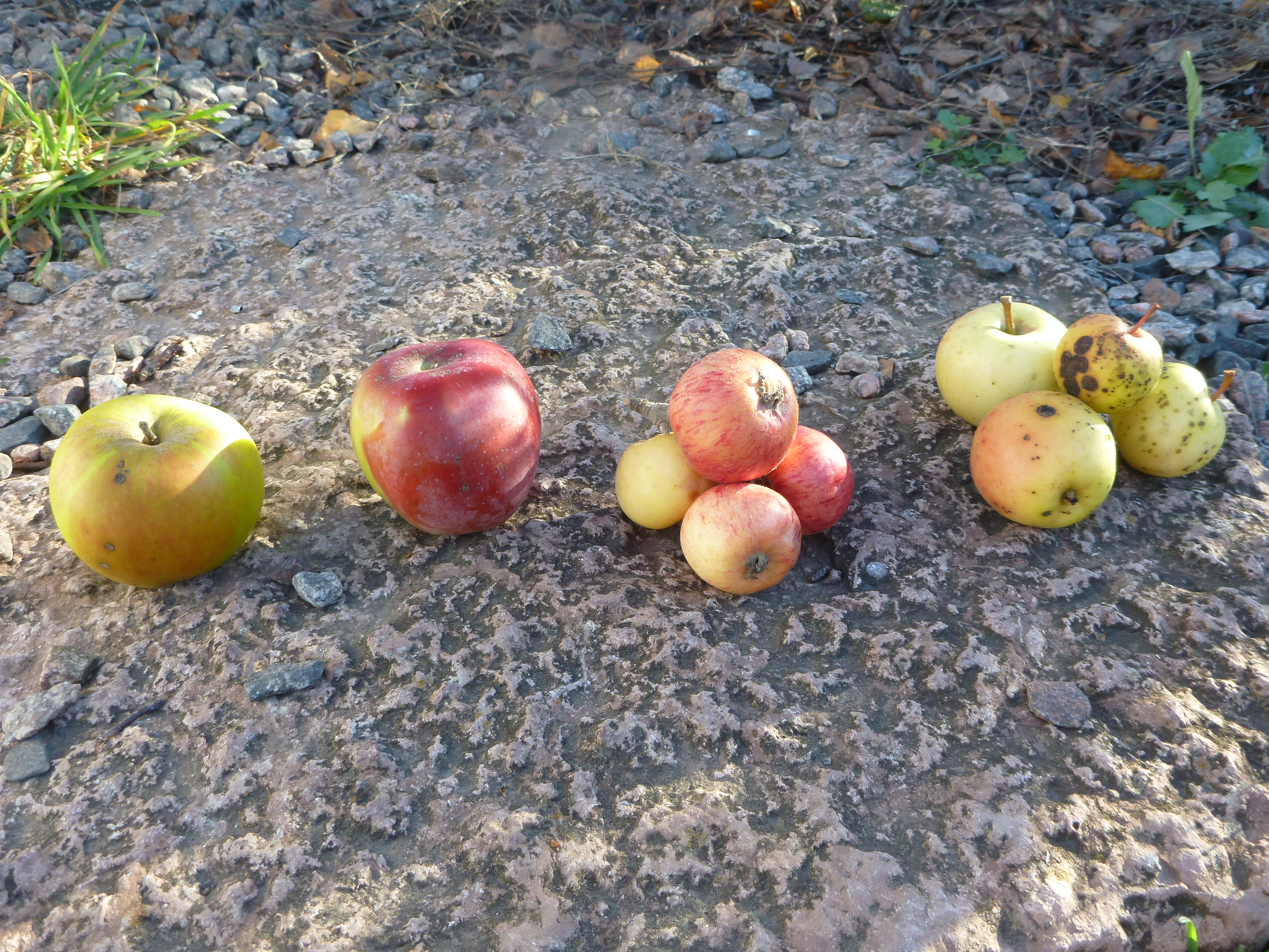 Receptet i bildformat. Från vänster, Cox Orange, Liljerumsäpplet, cideräpple och vildäpplen.