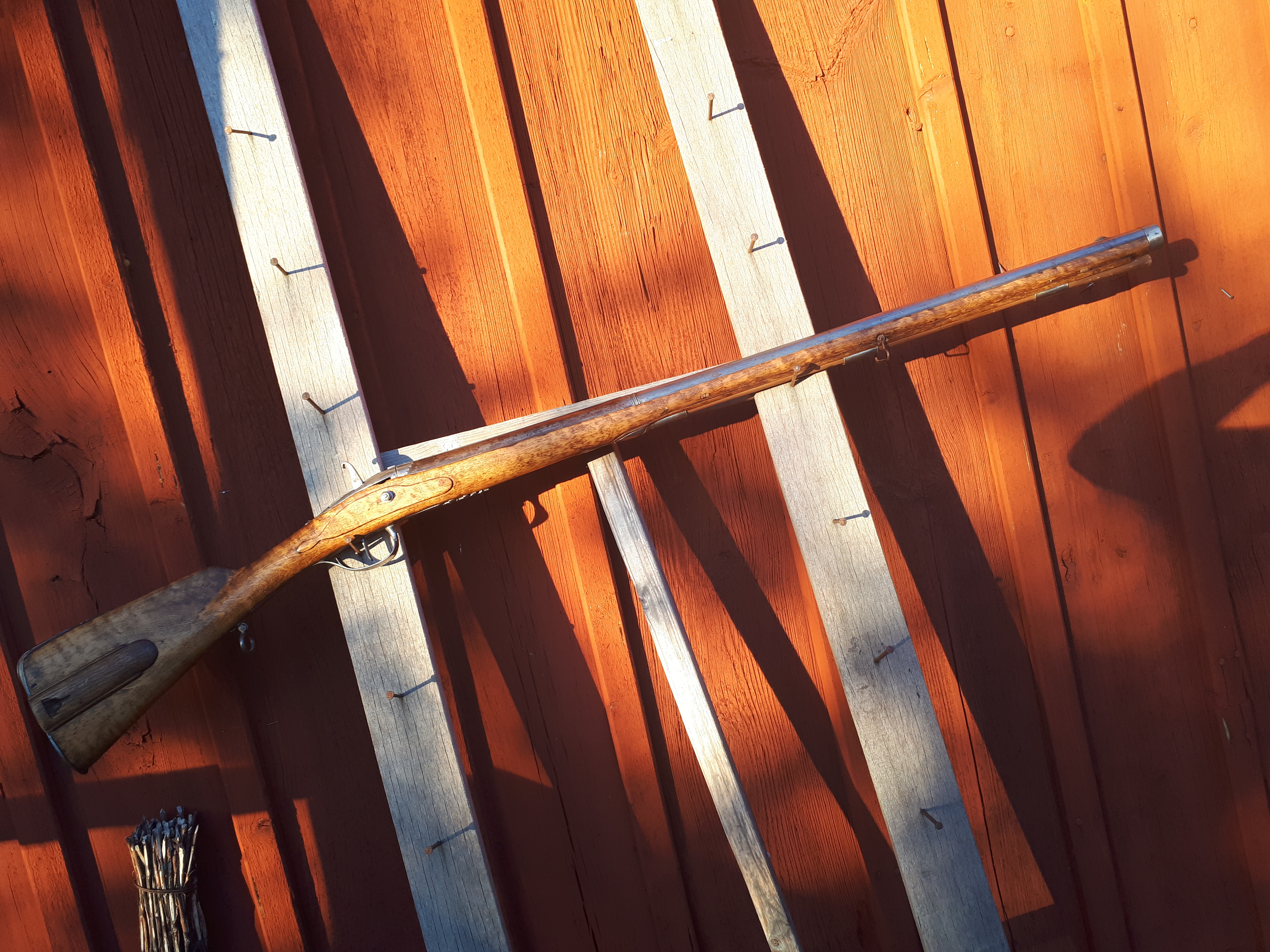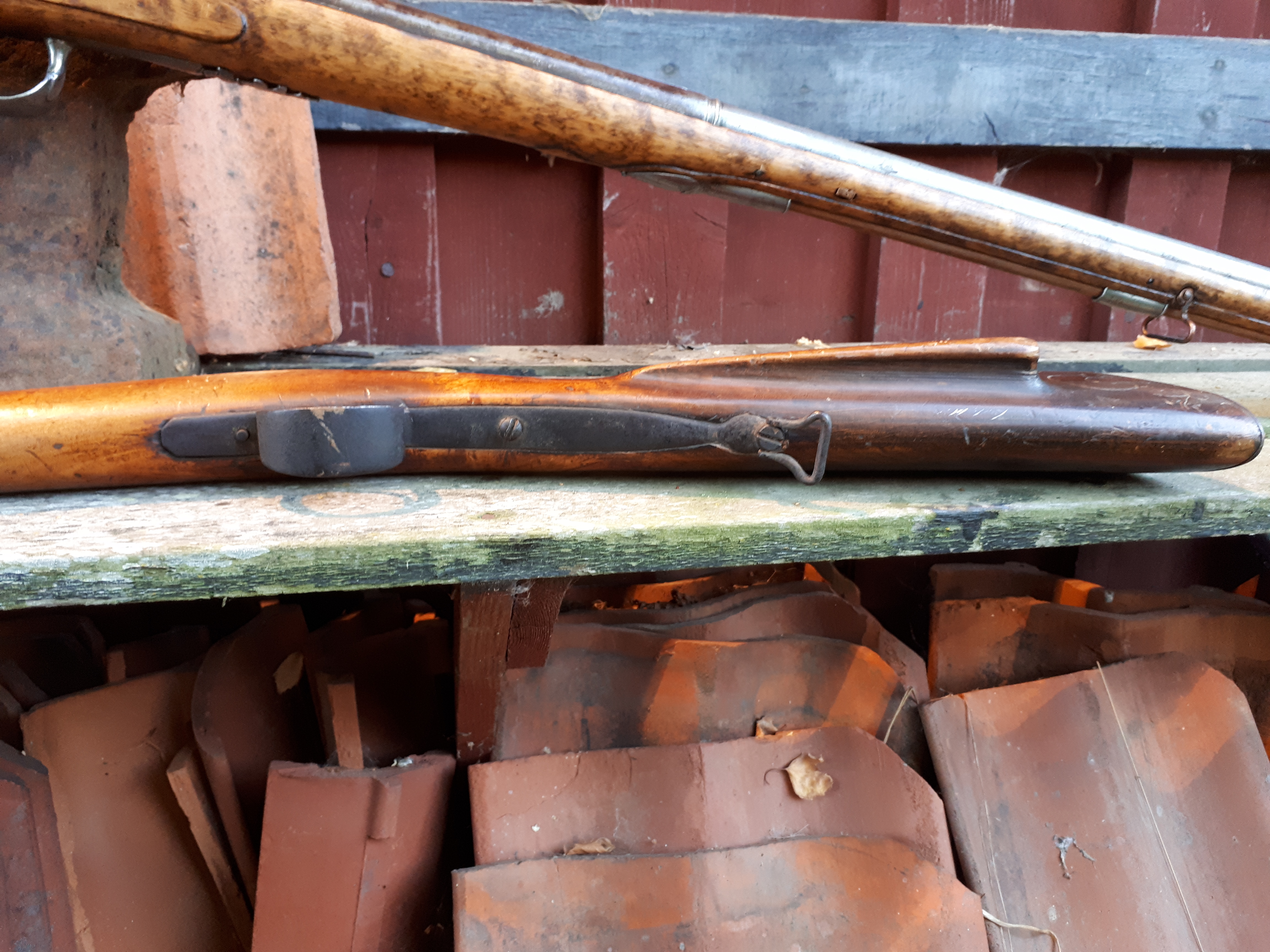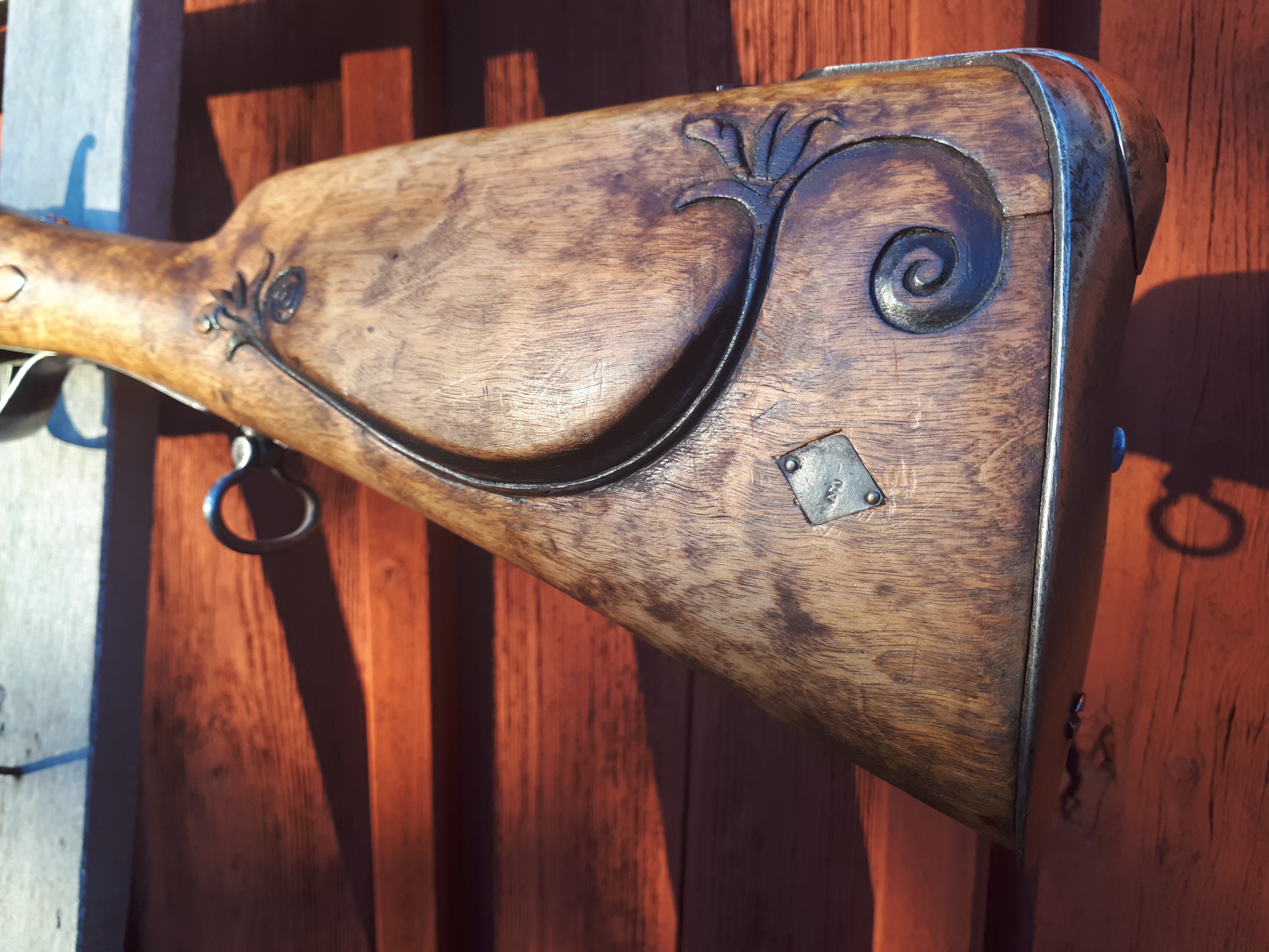 Detta är utan tvekan en bössa jag ställde mig väldigt frågande inför när jag skaffade den. Till utseendet påminner den mycket om formspråket på svenska högreståndsvapen från 1700-talets mitt. Ganska slank stock med tydstypiska skärningar för den tiden, skjutbart kolvlådelock och helstock. Det är inte oävet utfört men det är något av känslan från 1700-talet som inte finns där, dels är vapnet närmast oanvänt och dels för att formkänslan inte riktigt finns där, lite som om det vore en pastisch på 1700-talet. Kolven är av betsad flambjörk.