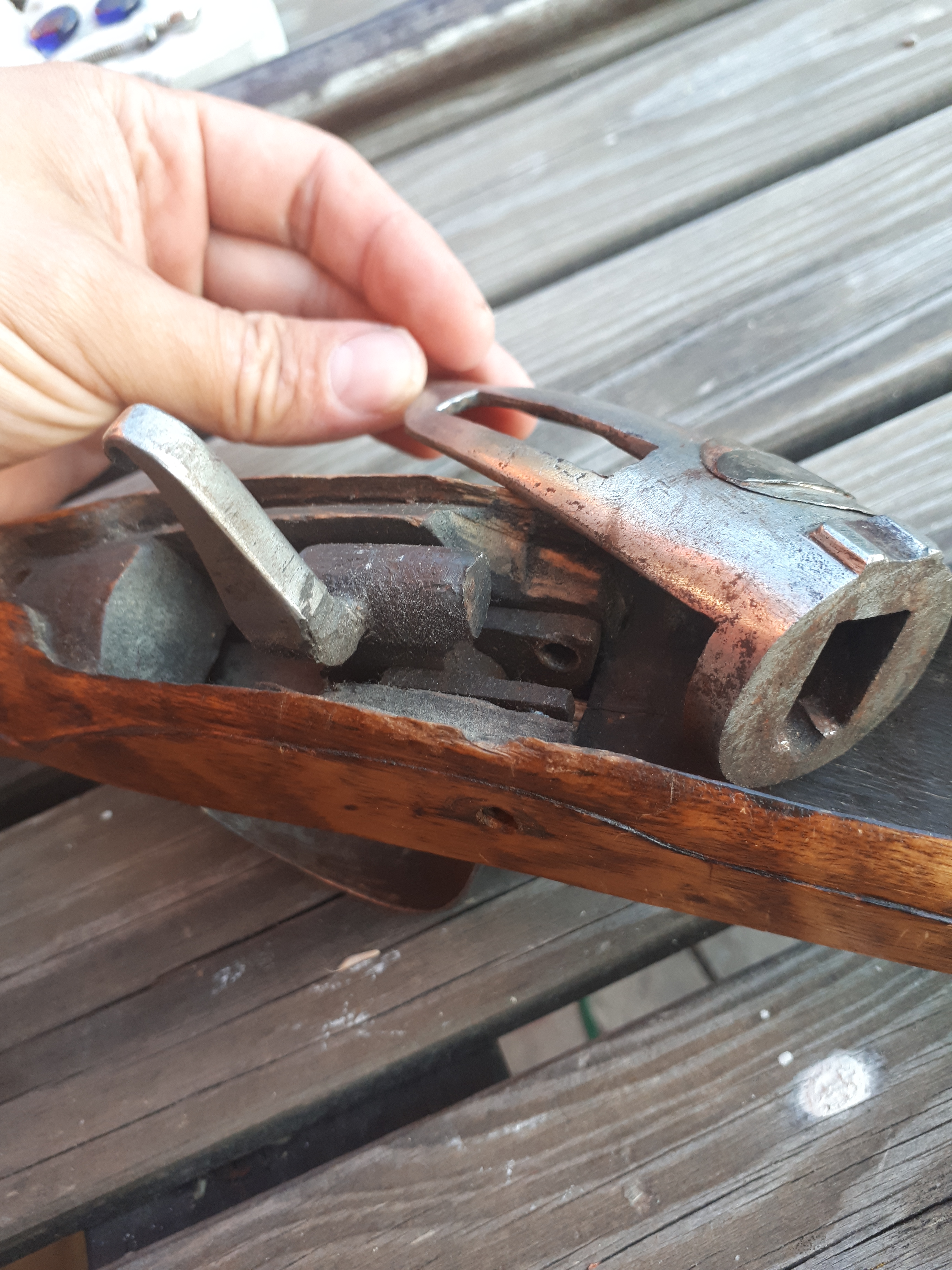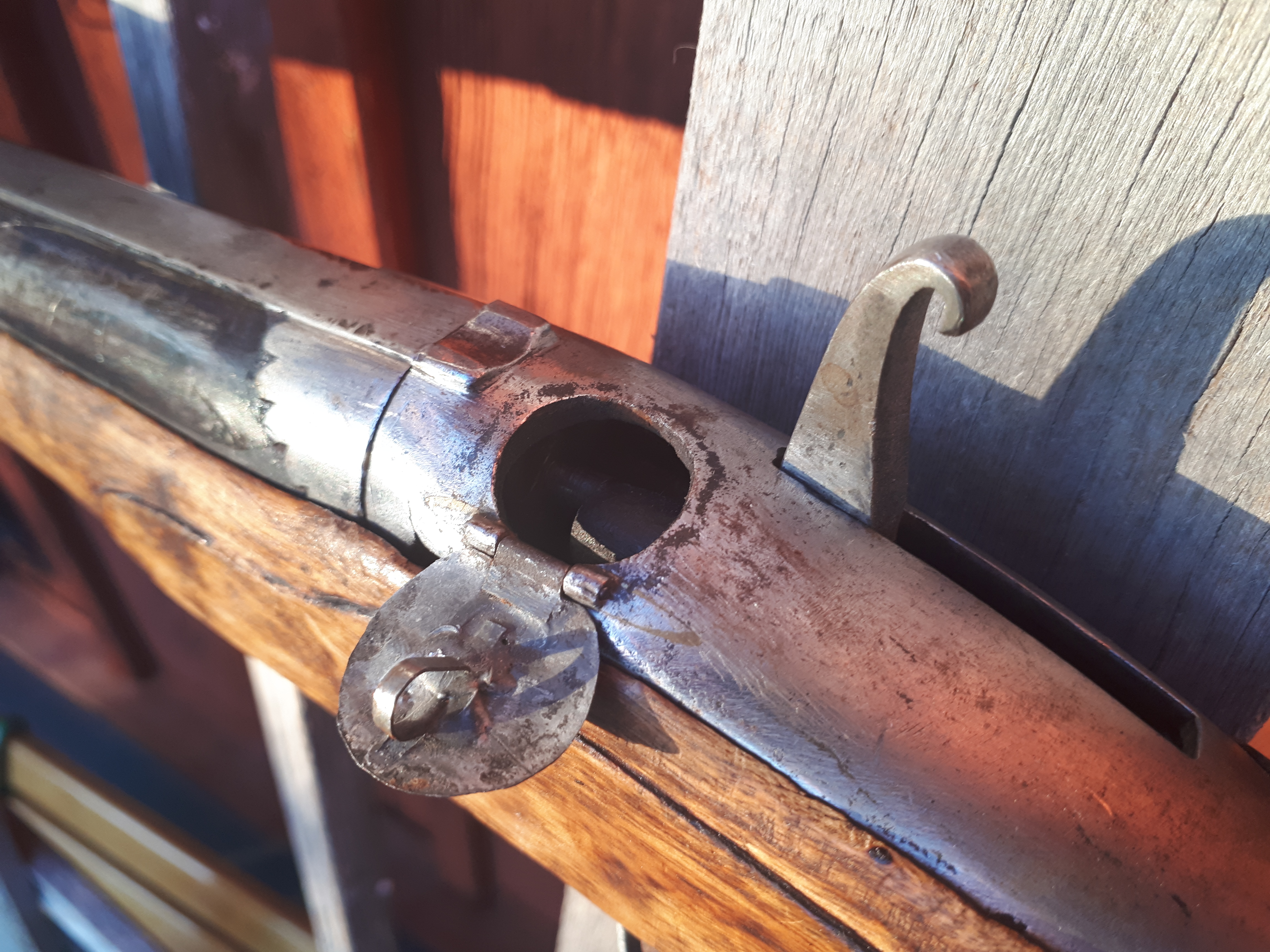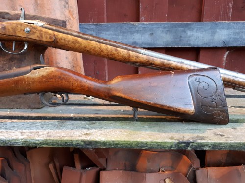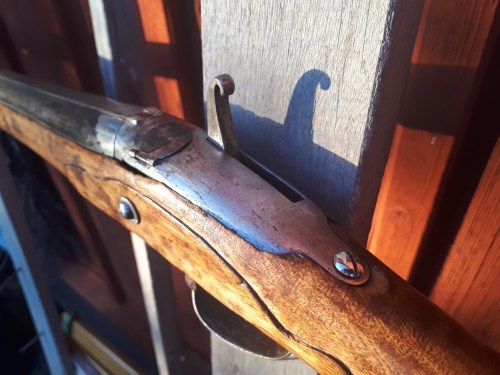 Detta är utan tvekan en bössa jag ställde mig väldigt frågande inför när jag skaffade den. Till utseendet påminner den mycket om formspråket på svenska högreståndsvapen från 1700-talets mitt. Ganska slank stock med tydstypiska skärningar för den tiden, skjutbart kolvlådelock och helstock. Det är inte oävet utfört men det är något av känslan från 1700-talet som inte finns där, dels är vapnet närmast oanvänt och dels för att formkänslan inte riktigt finns där, lite som om det vore en pastisch på 1700-talet. Kolven är av betsad flambjörk.