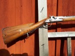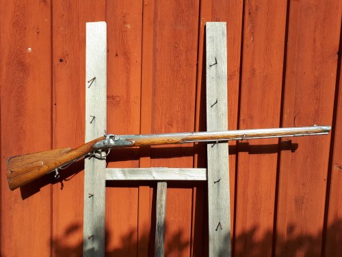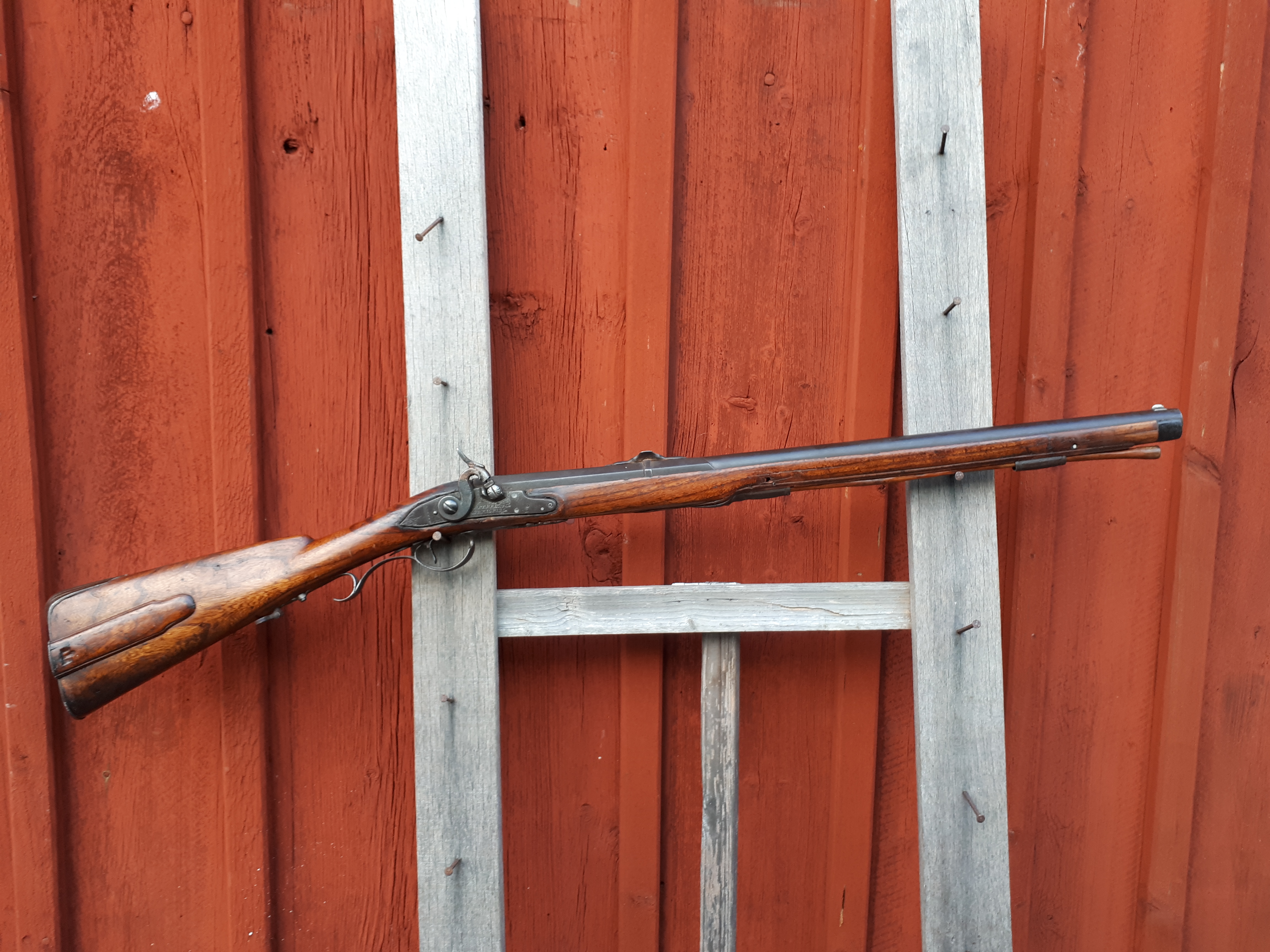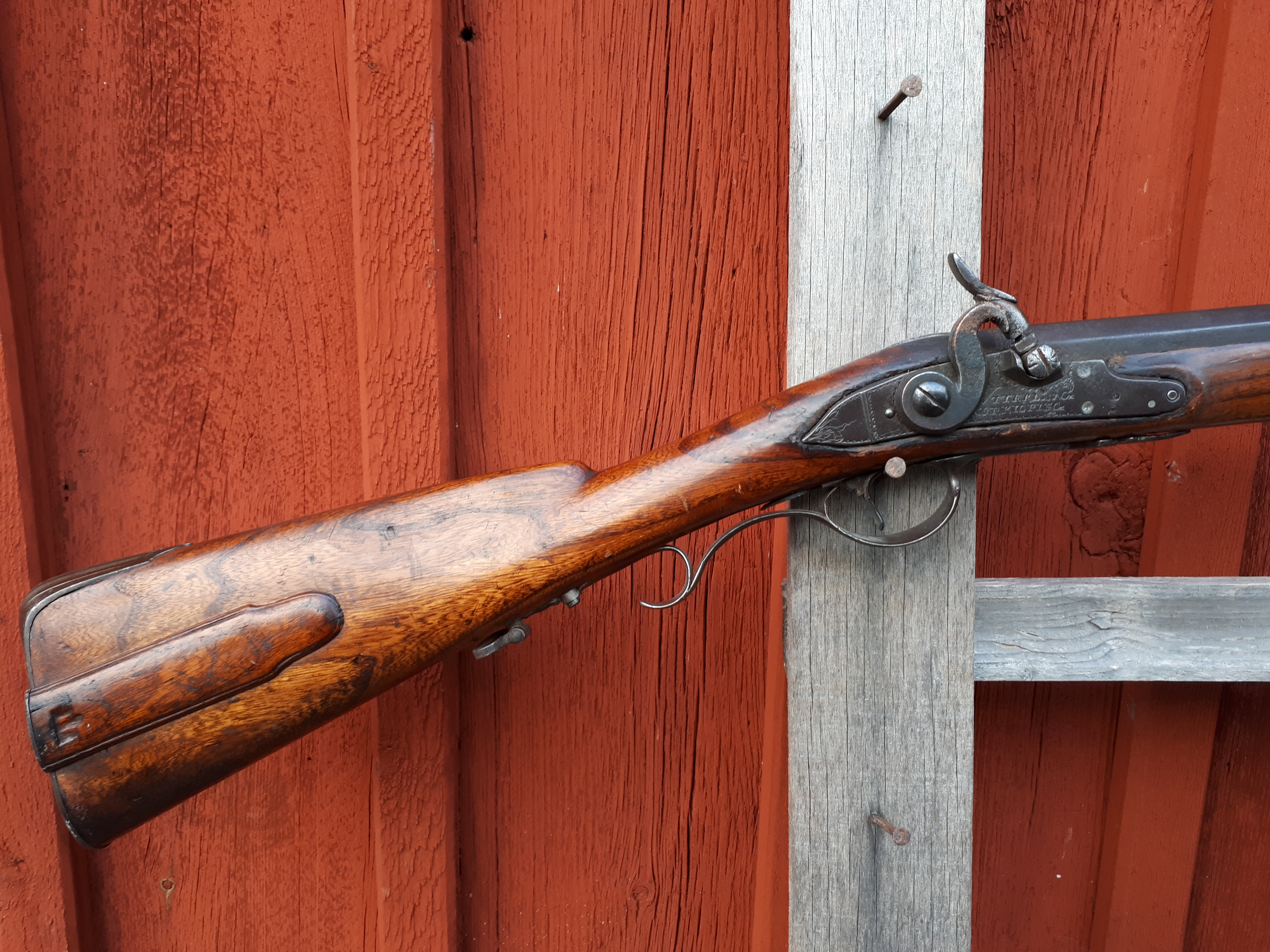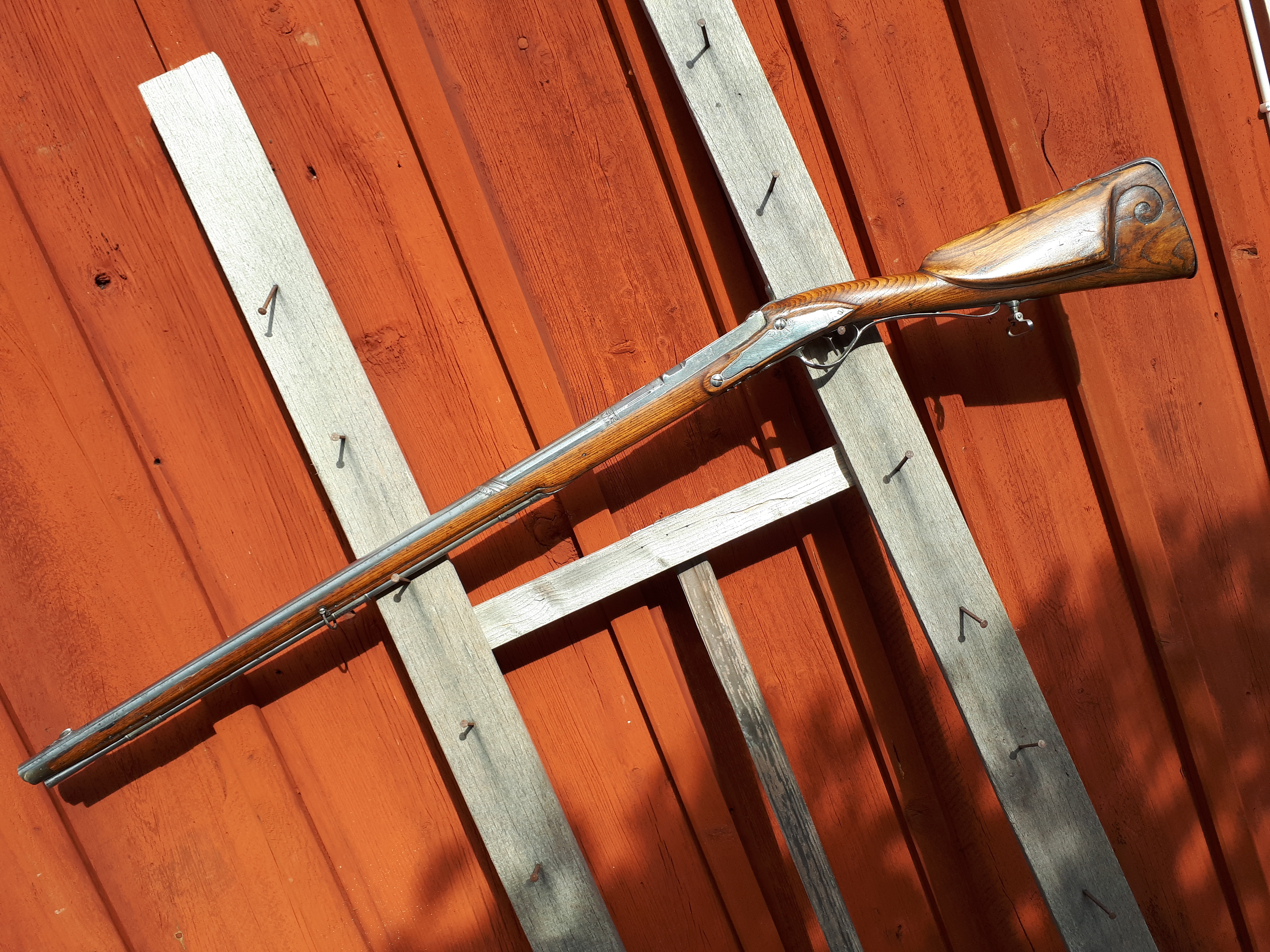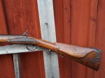 Den här bössan är stockad i en sober svensk almstock. Beslagen är välgjorda och graverande, stilen tyder på att de förmodligen inte är svenska. Jag förmodar att stockningen gjordes i slutet av 1700-talet i Sverige av någon finare utländsk bössa. Den konverterades senare till slaglås.