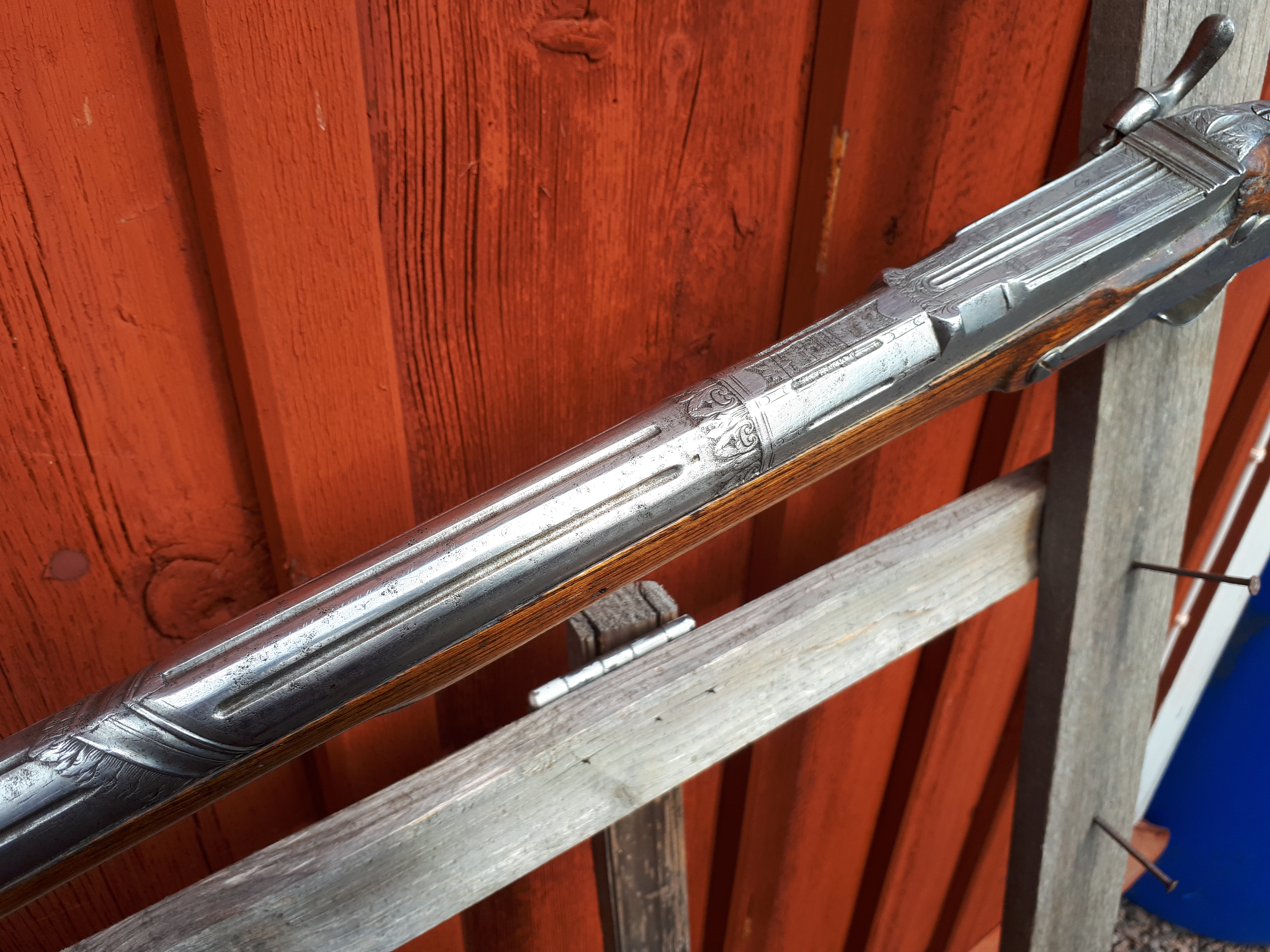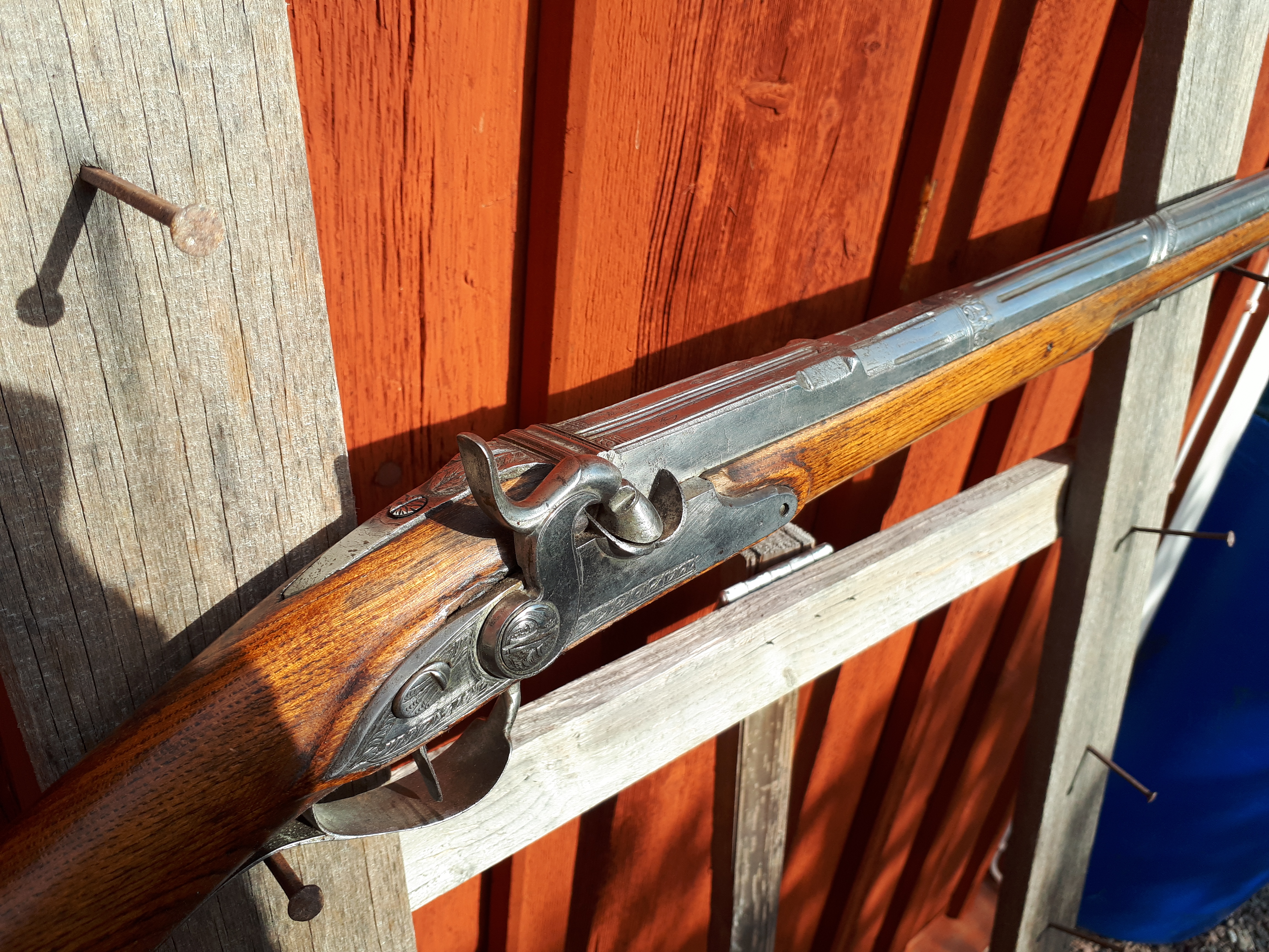 Men nu var det pipan jag skulle skriva om. Pipan är betydligt äldre och har en annan historia. En förgylld smidesstämpel med en tupp och initalerna MG är inslagen uppå pipan. Stämpelns ägare är Michael Gull, bössmed i Wien 1647-1679. Troligen är pipan från början en hjullåsstudsarpipa som tagits om hand av Utterbergs verkstad. Jag har hittat lite bilder på originalvapen av Gull och hans produktion höll högsta klass för sin tid. Det finns också två hjullåsstudsare i Skokloster slottssamlingar, det tyder på att hans vapen hade viss spridning till bland annat Sverige.