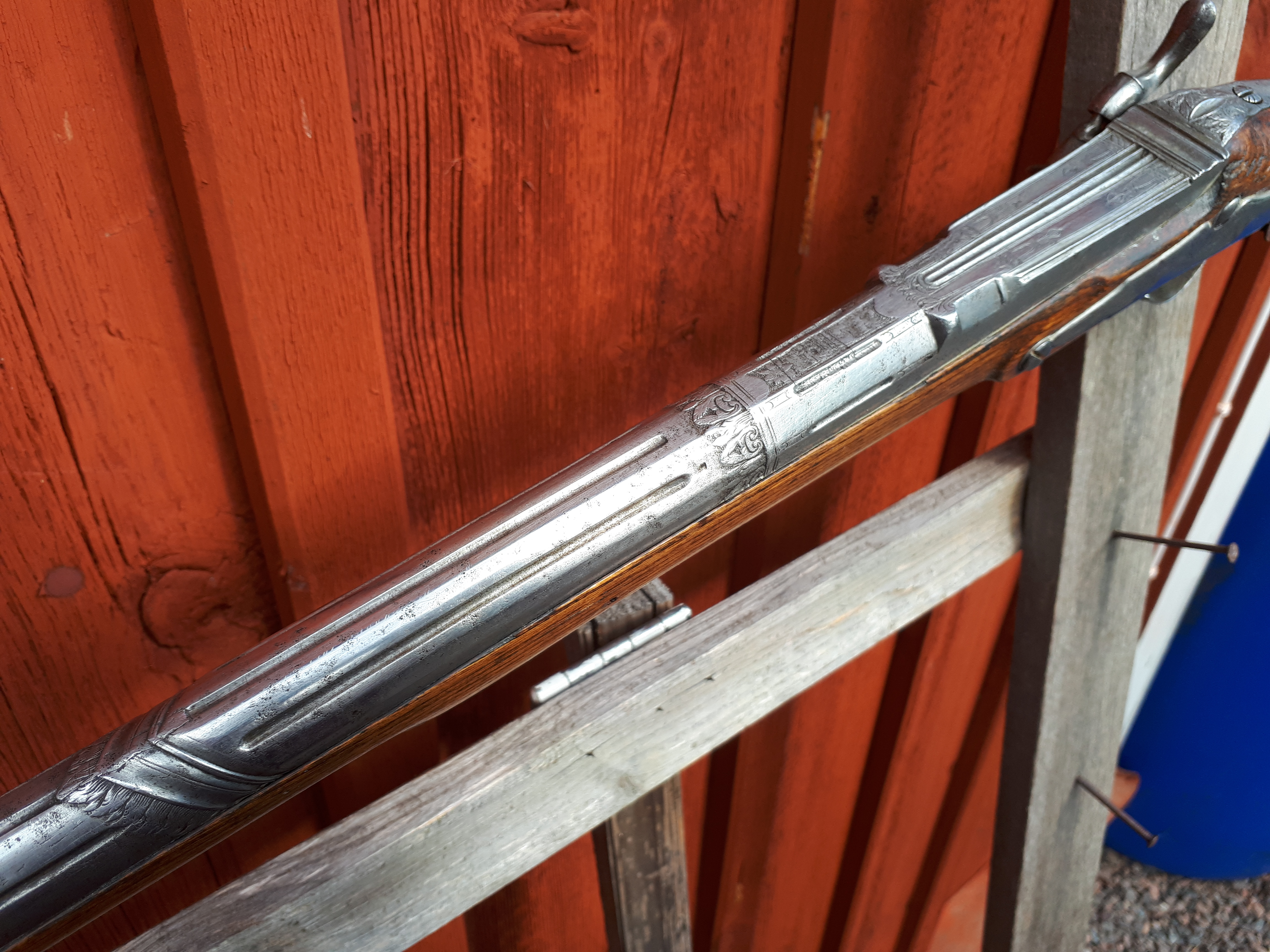 Det är pipan som spelar huvudrollen och den huvudsakliga anledningen till att jag köpte den. Pipan är en kistpipa, en ovanlig sorts pipa med ett fyrkantigt kammarstycke. Kistpipor dyker upp ibland och de är ofta gamla, gärna från 1600-talet. Det som står ut med denna är att den är överdådigt dekorerad med gravyr, flutning och olika sektioner. Vapnet pipan tillverkades för från början höll troligen högsta klass. Under 1700-talet borrades den upp för hagelskytte men var troligen finkalibrig från början.