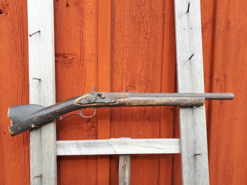 Åter igen ska vi prata om pipor. Detta är en kort och smidig påk från 1700-talets mitt, tillverkad av Peter Utterberg (tidigare beskriven i helgens sovelpåk I). Stockningen är märklig, nästan lite amatörmässigt formgiven. Det är inte gjort av någon som Utterberg brukar anlita. Det märkligaste är den lilla blomman och det blev ju inte så snyggt. Balansen med den korta pipan är emellertid fenomenal. Konverteringen till slaglås är fruktansvärd.