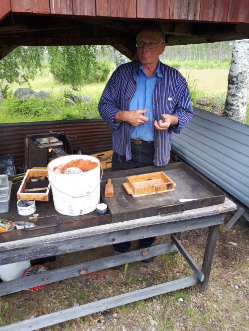 Efter besöket i smedjan fick vi ta del av några av Wibergs samlade kunskaper rörande gelbgjutning och omhärdning av eldstål och fjädrar. Just gelbgjutning medelst flaskgjutning var en vanlig metod förr bland bössmederna för att få fram beslag men även billiga men prydliga lås. Järndelar tar längre tid att smida och bearbeta men att gjuta kopior av en förlaga går förhållandevis snabbt.