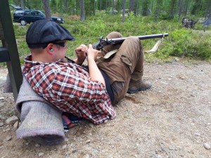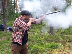 Nu var det dags för en riktig allmogebössa av Bingstatyp med en kaliber runt 15 mm. Förhållandevis tung och lång i kroppen ger vid handen att den nyttjas till allahanda jakt på större djur. Jag valde en sittande ställning men det hjälpte föga när jag vinglade till i skottet. En i övrigt potent men lättskjuten bössa.