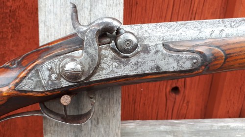 Slaglåskonverterad bössa, signerad Ekvall. Foto: Stockholms auktionsverk.