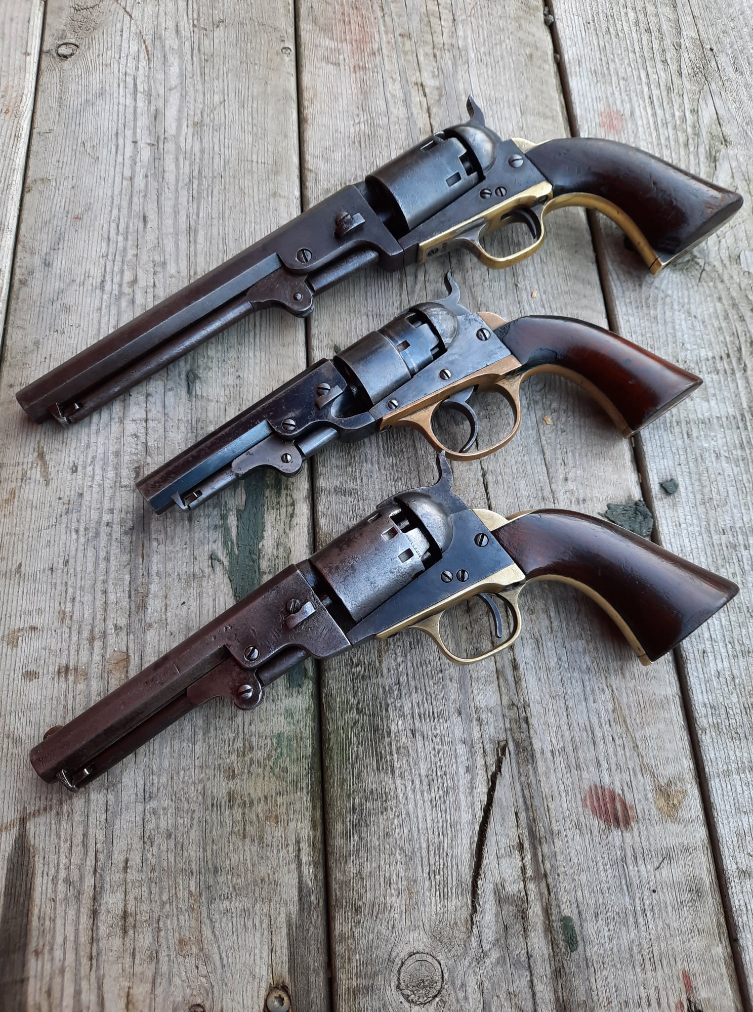 Här ser ni tre stycken coltar i kaliber .36, fast ingen är en riktig Colt. Det nedersta är en Manhattan Arms revolver tillverkad på 1860-talet. Konstruktionsmässigt som en Colt 1851 navy bortsett från att den i storlek ligger mellan en Colt navy och en Colt Pocket. Manhattan plagierade colten revolvern men gjorde den i en egen storlek. För att visa på lite egen kreativitet lade de till extra säkerhetslägen på trumman. Manhattan Arms låg i flera tvister med Colt. Många menar idag att Manhattan faktiskt höll bättre kvalitet än Colt själv.