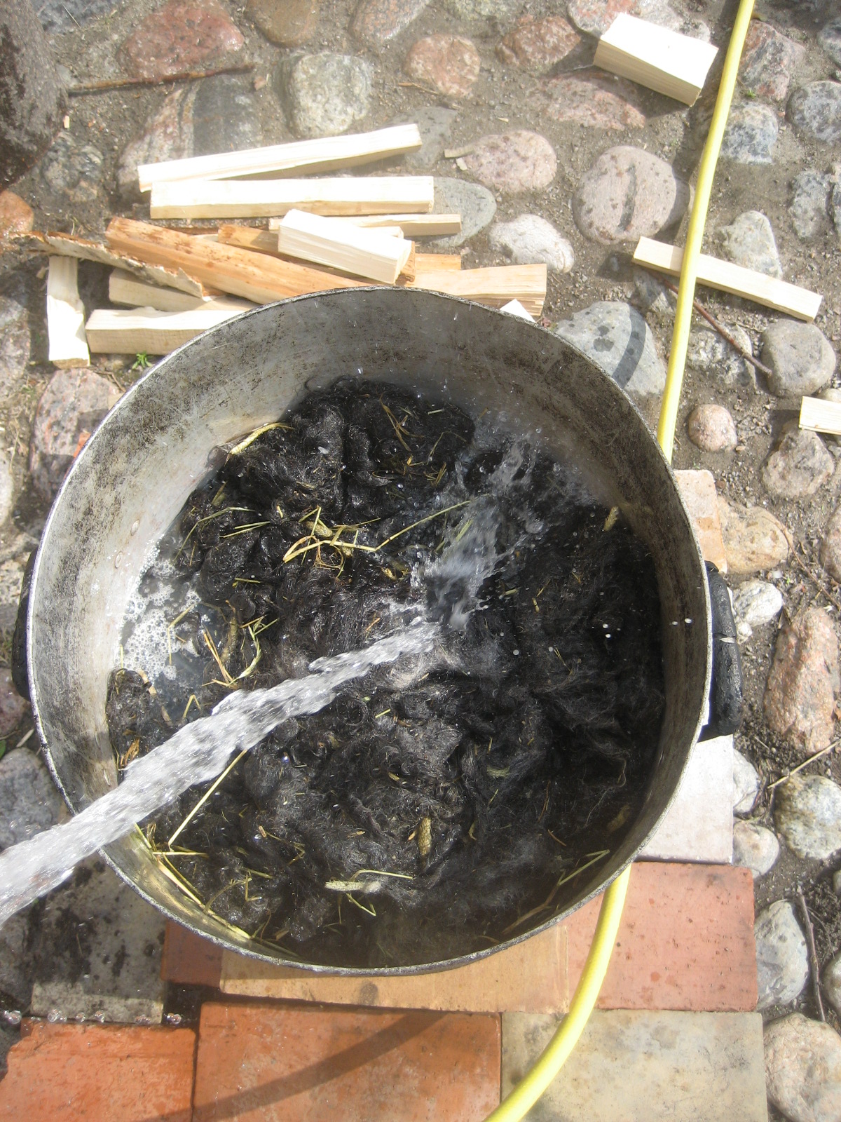 2. Slå på vatten så att det precis täcker ullen. Precis som med alla andra gamla självhushållningsrecept går det bra att ersätta vattnet med kiss. Jag var inte så nödig så jag tog vatten. Tillsätt också några matskedar salt (antagligen istället för kiss).