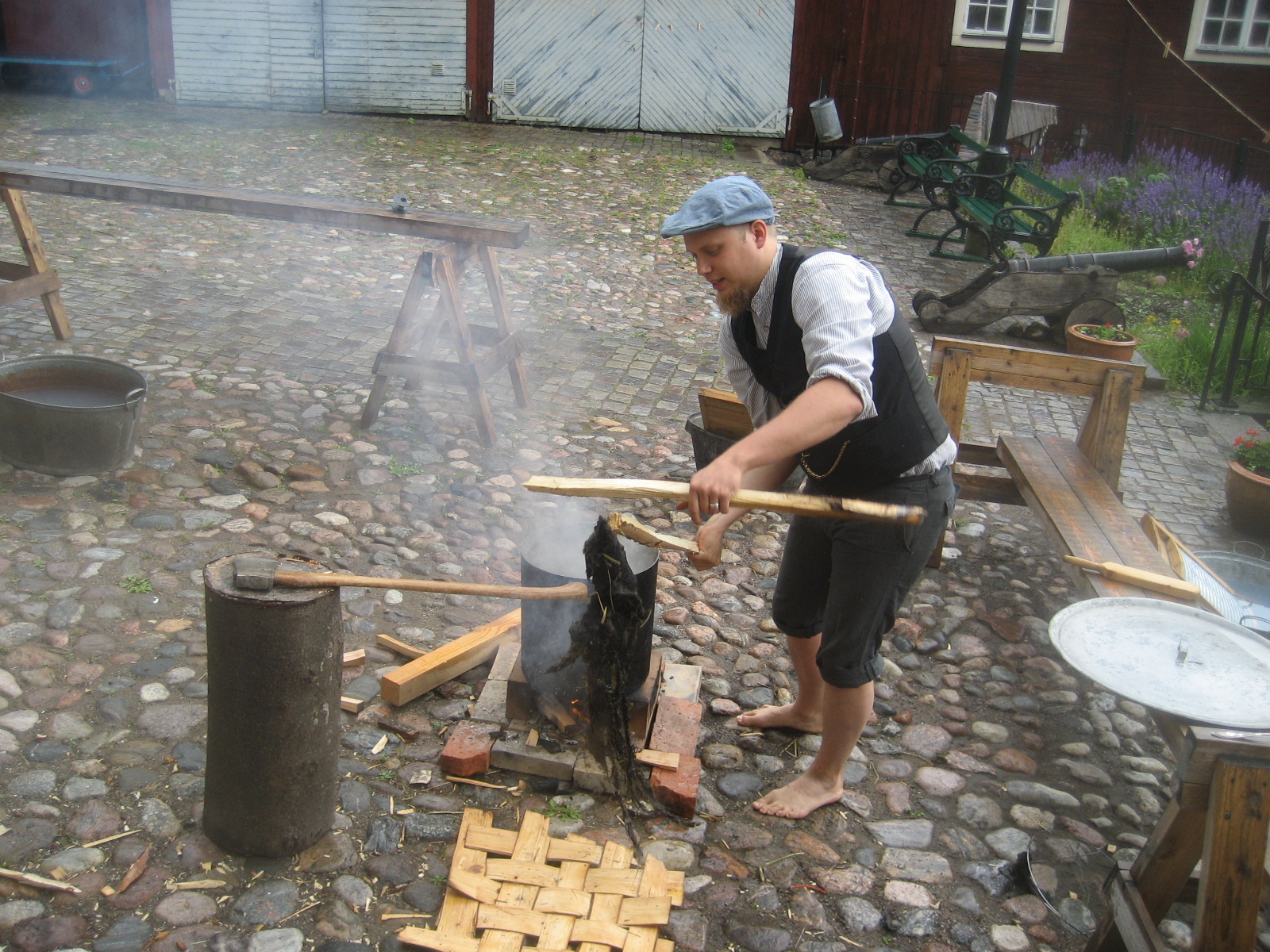 4. Avlägsna ullen. Snida ihop den speciella spånmattan du måste tillverka av handklyvna takspån att lägga den förbrukade ullen på. Nu är det bara att fortsätta att koka bort vattnet.