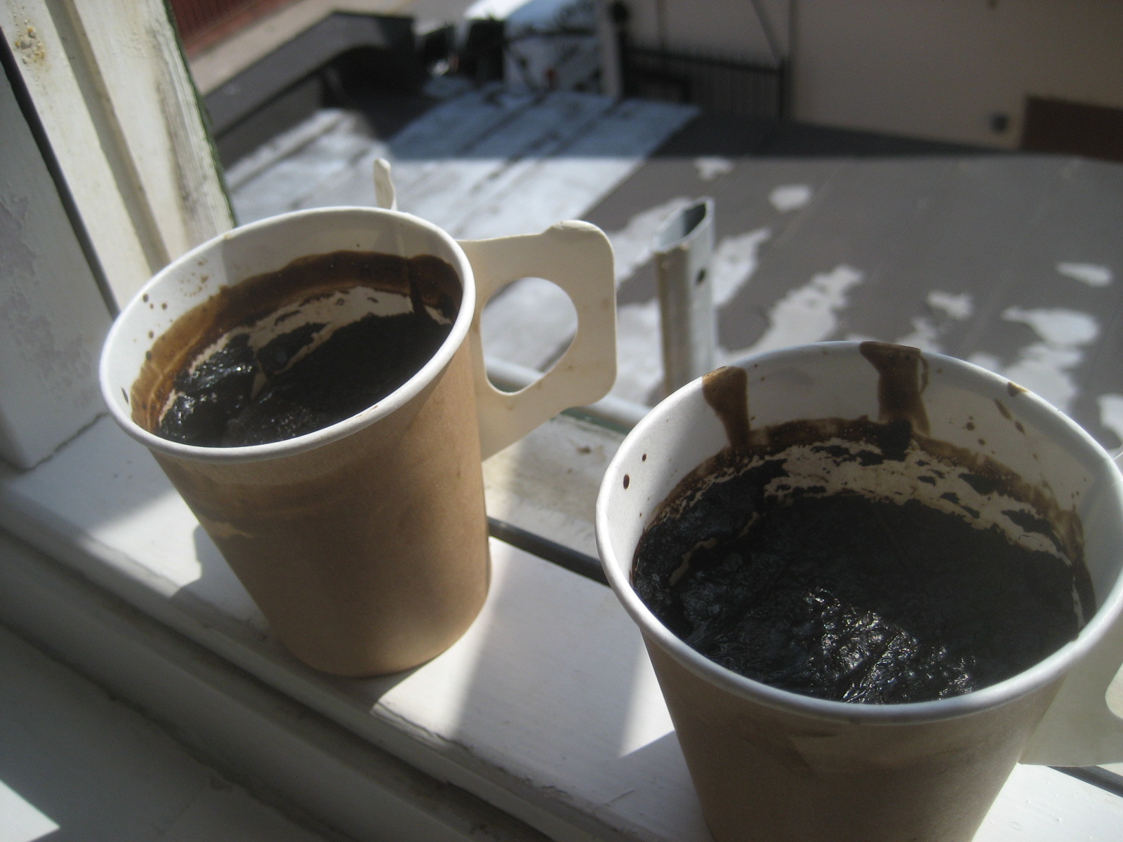 5. Nu bör det framkomma fettklumpar på ytan. Nu uppstår det en störning mellan mitt experiment och Ruths. När Ruth gör detta i rutan skummar hon av ytan, lanolinet ligger som en kritvit, fluffigt vacker alptopp överst medan mitt fett är en grådaskig grynig massa som simmar i en sjö av bajsvatten. Vad har de för får i England egentligen? Änglafår som nätt trippar fram på böljande gräsmattor och äter bomull och dricker väteperoxid? Jag har verkar ha kommit över någon slags inavlad gammelsvensk lantras som lever på bark, grus och pottaska och som i sina glädjestunder får knappra på asbest och murkna vedträn.