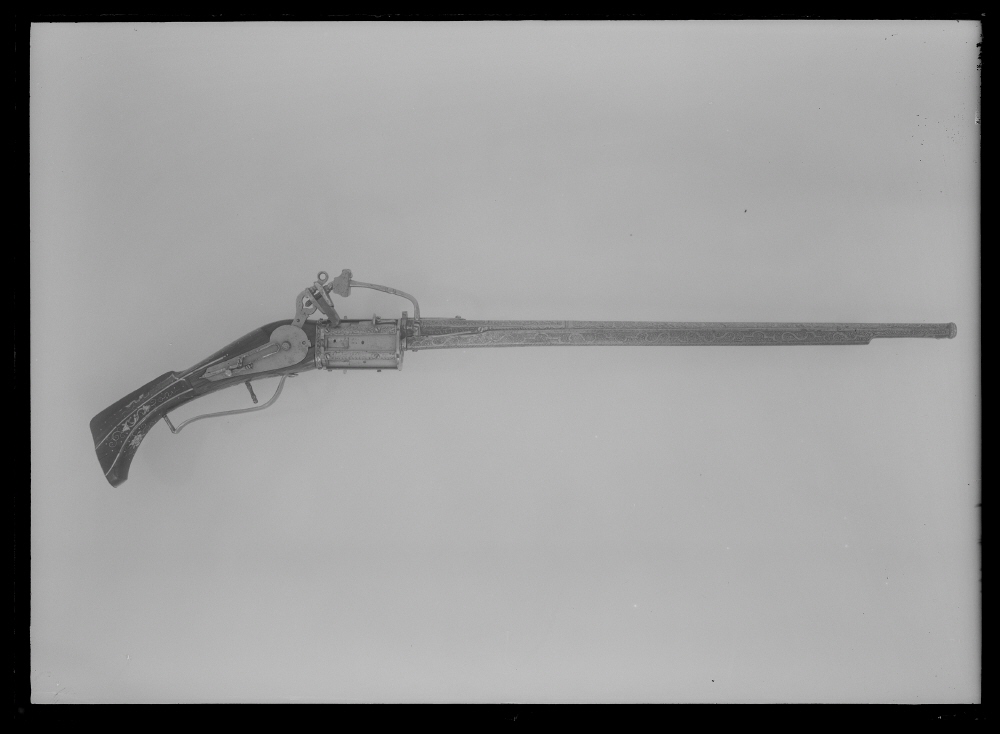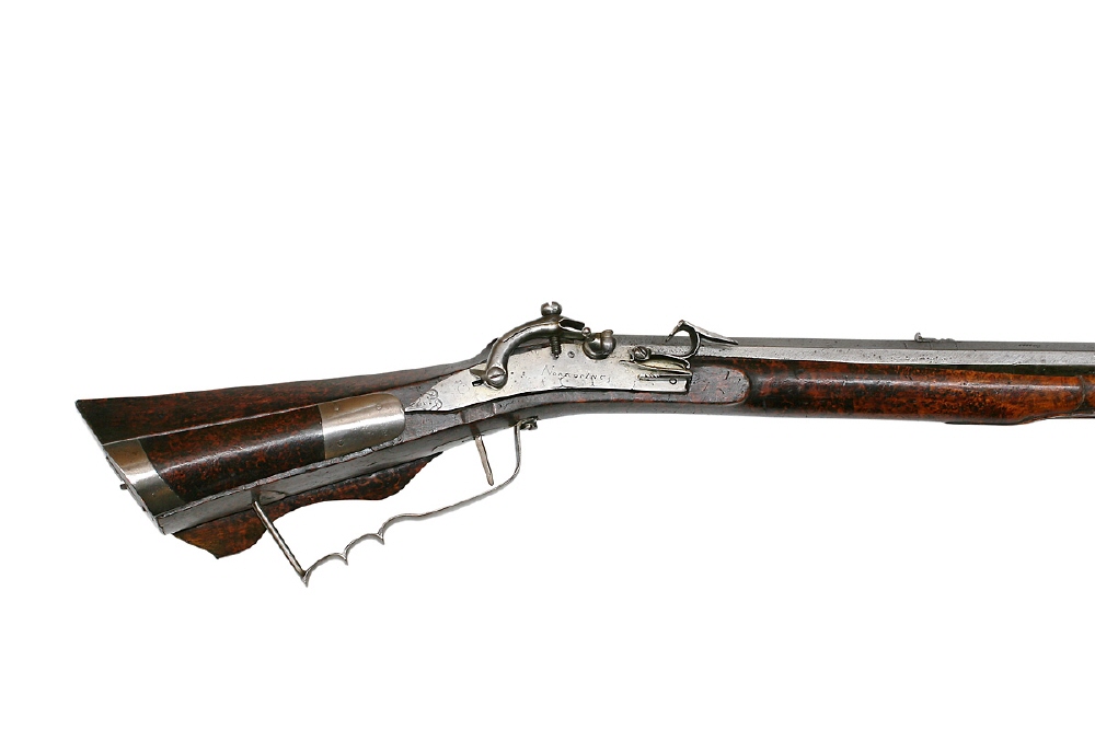 Tysk hjullåsstudsare ombyggd i baltikum till flintsnappstudsare, tillverkad av Johan Krach (verksam i Suhl 1636-1686.).  Foto Livrustkammaren.