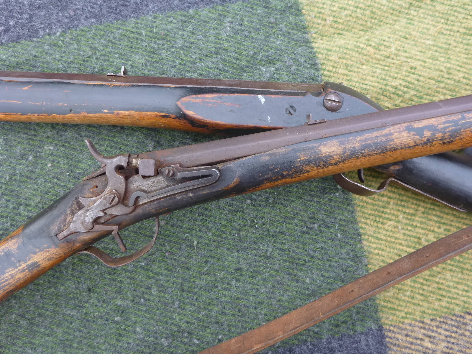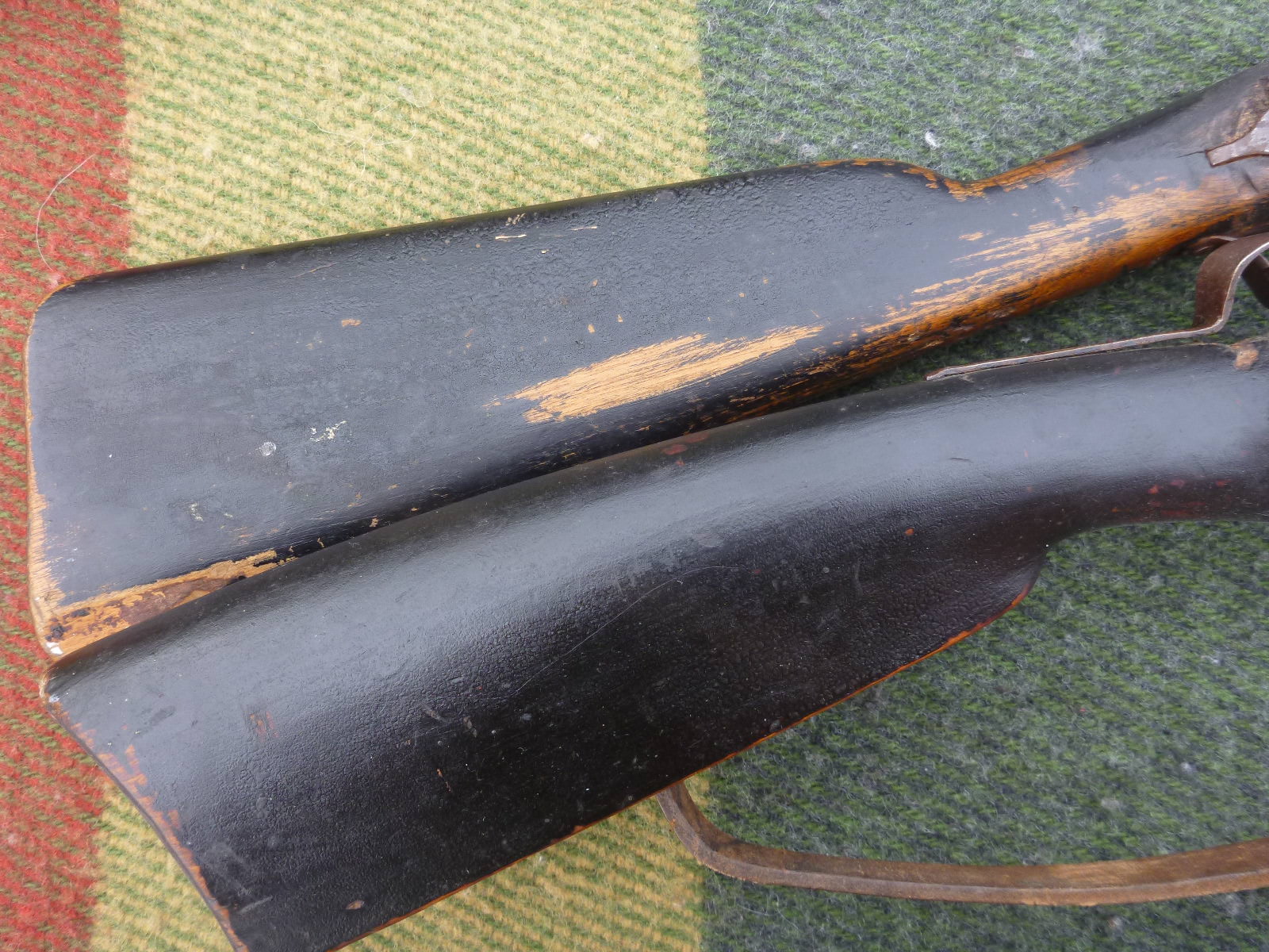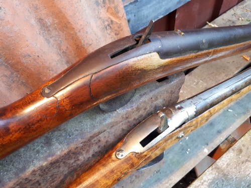 Två hagelbössor med militära lås. Grovhuggna björkstockar och återanvända militära beslag och pipor.
