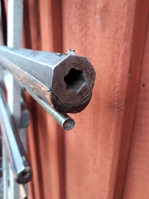 Vad är nu detta?  Ingen aning om jag ska vara ärlig. Total avsaknad av stämplar, okänt träslag och blandning av mässing och järn. Till estetiken påminner det lite om en Brown Bess som skalats ner till en dambössa. Pipan har haft ett litet sikte på pipan har märkningar framtill efter modifieringar. Pipan har försetts med ett järnband längst fram likt en trumf. Det har jag sällan skådat förut. Jag misstänker att stocken är i björk då den är fjäderlätt och att den betsats valnötsbrun. Underbeslaget är av militär typ och låset är ett konverterat flintlås, troligen svenskt armélås som haft varhake. Återkommer med exakt modell. Jag tror det rör sig om ett halvfolkligt bygge av diverse olika delar från sent 1800-tal.