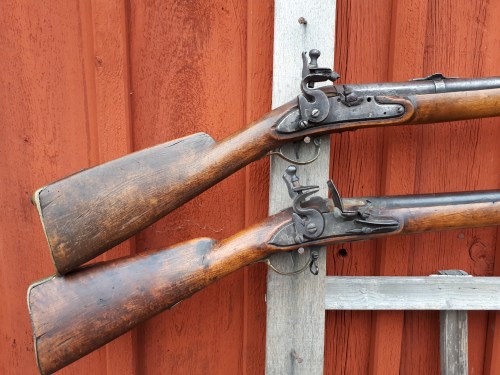 Här ses två intressanta lås, det övre är ett svenskt muskötlås m/1731 som på enklast möjliga vis konverterats till slaglås genom att avlägsna eldstål och fjäder. En förhållandevis sällsynt men intressant slaglåskonvertering. Den undre har svenskt muskötlås m/1747 och blandade ryska och svenska delar i övrigt. Det är ganska sällsynt att hitta renodlade allmogevapen med franskt flintlås.