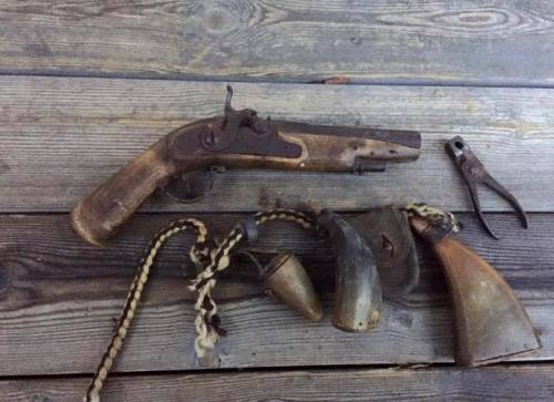 En ovanlig norrländsk pistol, en räfflad ”lodpistol” med tillhörande gehäng. Tillverkad av Mårten Mårtensson (1835-1918), Gråsjön Kall. Foto: Ronny Berglund.