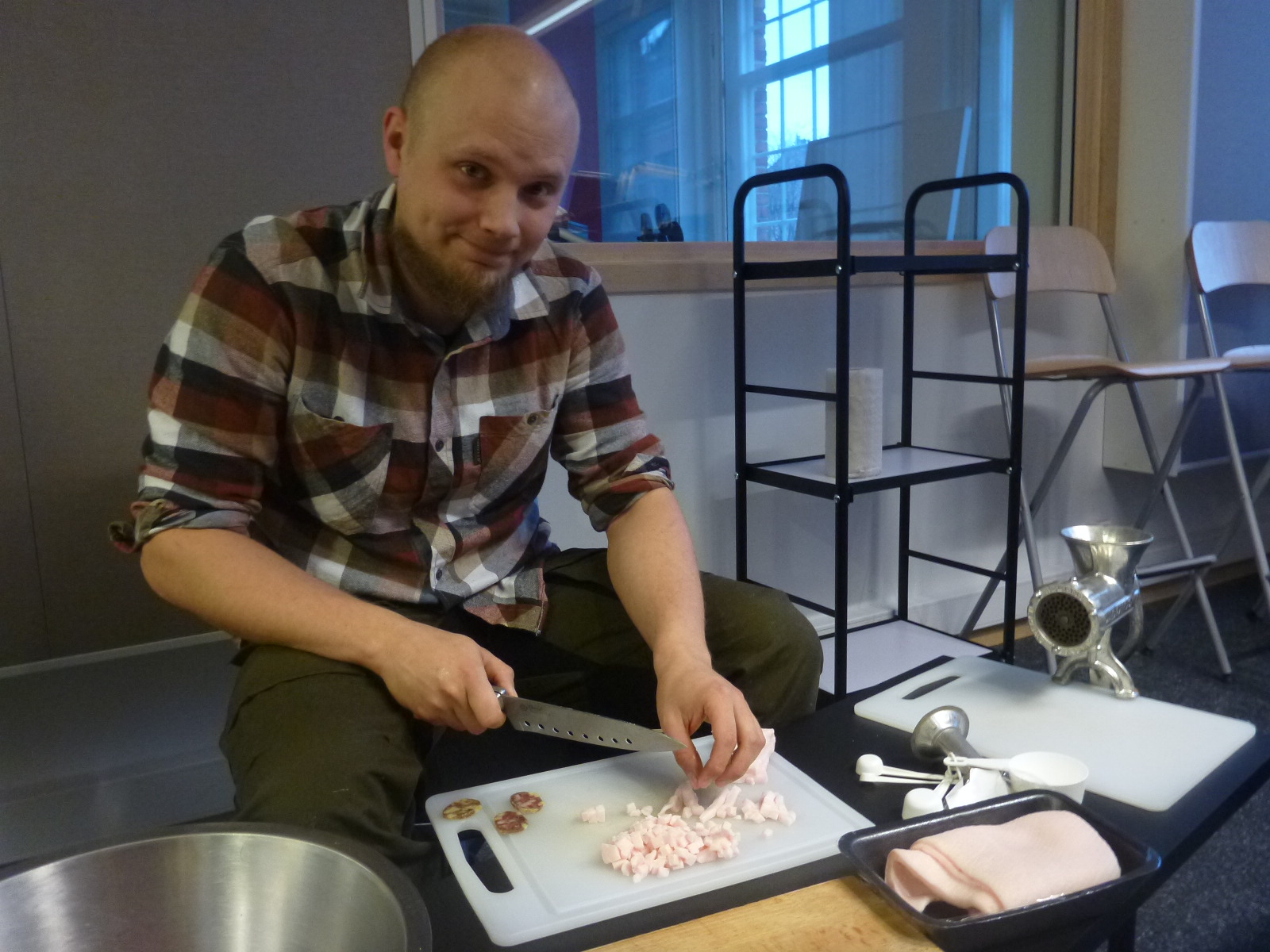 DSCN1109Med stor noggranhet skäres späcket i små tärningar och dagavlönaren Johnny Lindberg medans apotekarstudentskan Helena Thun Westerberg arbetar med kvarnen.